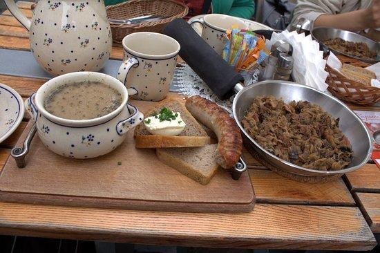 За углом у Абсурда "легендарное", как они сами называют себя, да и количество народа это подтверждает, заведение с пызами - клецками с мясом. Тут же можно съесть жутко жирный журек. Все подается в банках, ковыряется вилкой.
