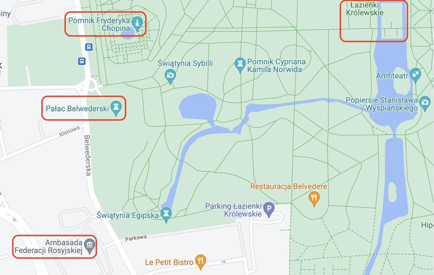Наиболее оптимальный маршрут: приехать к памятнику Пилсудскому у входа в Лазенки, посмотреть российское посольство, Бельведер и памятник Шопену, дальше углубляться в Лазенки и гулять по вкусу, выходить где придётся.