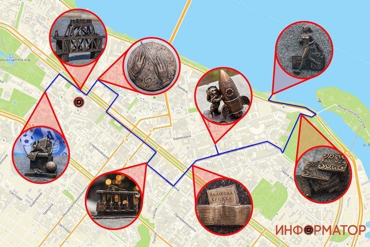 Скульптуры представляют из себя предметы, так или иначе связанные с городом: печенье "Дніпро", ракета, трамвай, мост, фанатская атрибутика футбольго клуба "Днепр" и другие фигурки.