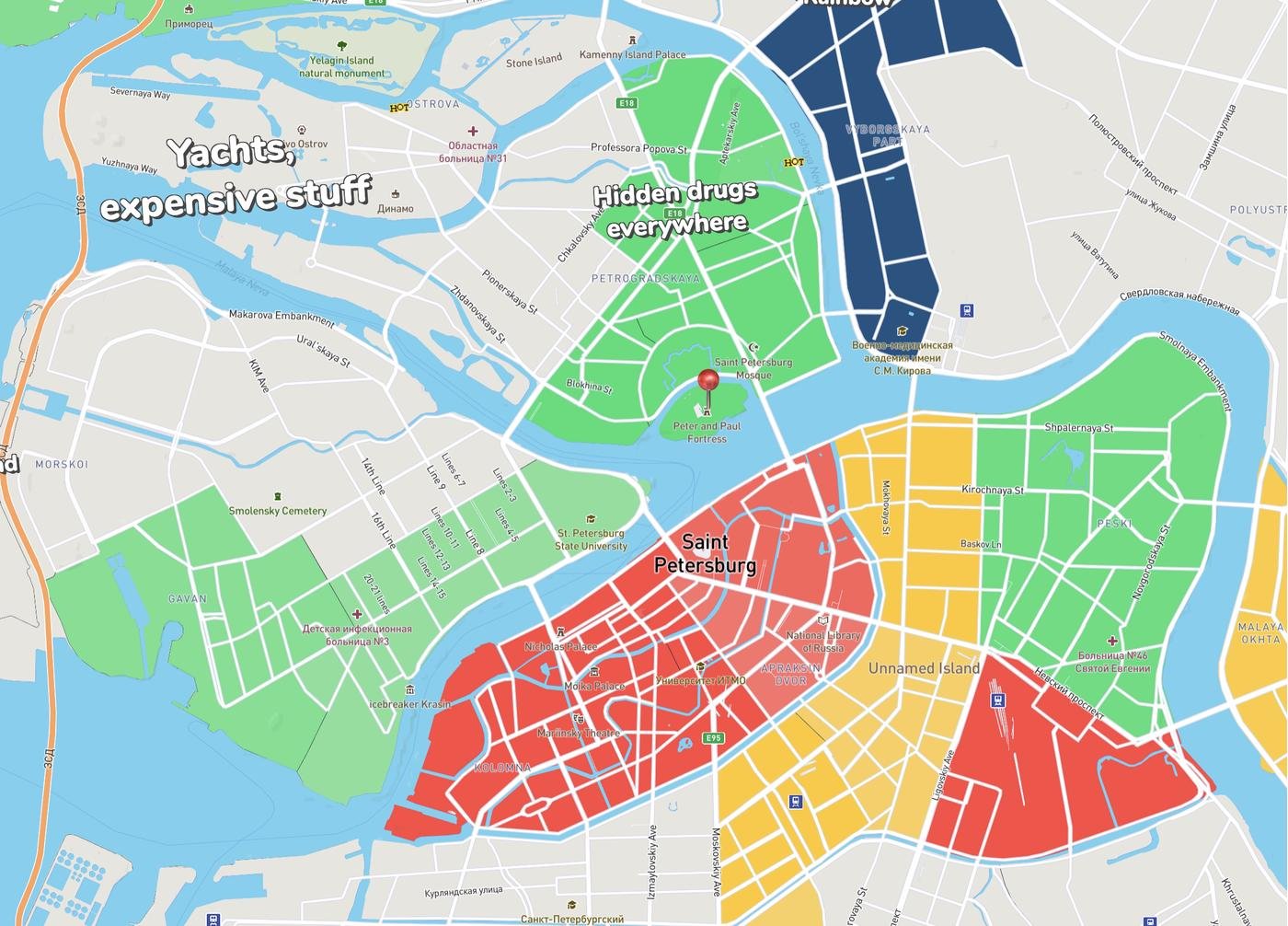 На HoodMaps есть карта, довольно информативная – лучше смотреть на районы там, не все теги хорошо поместились на этот скриншот.