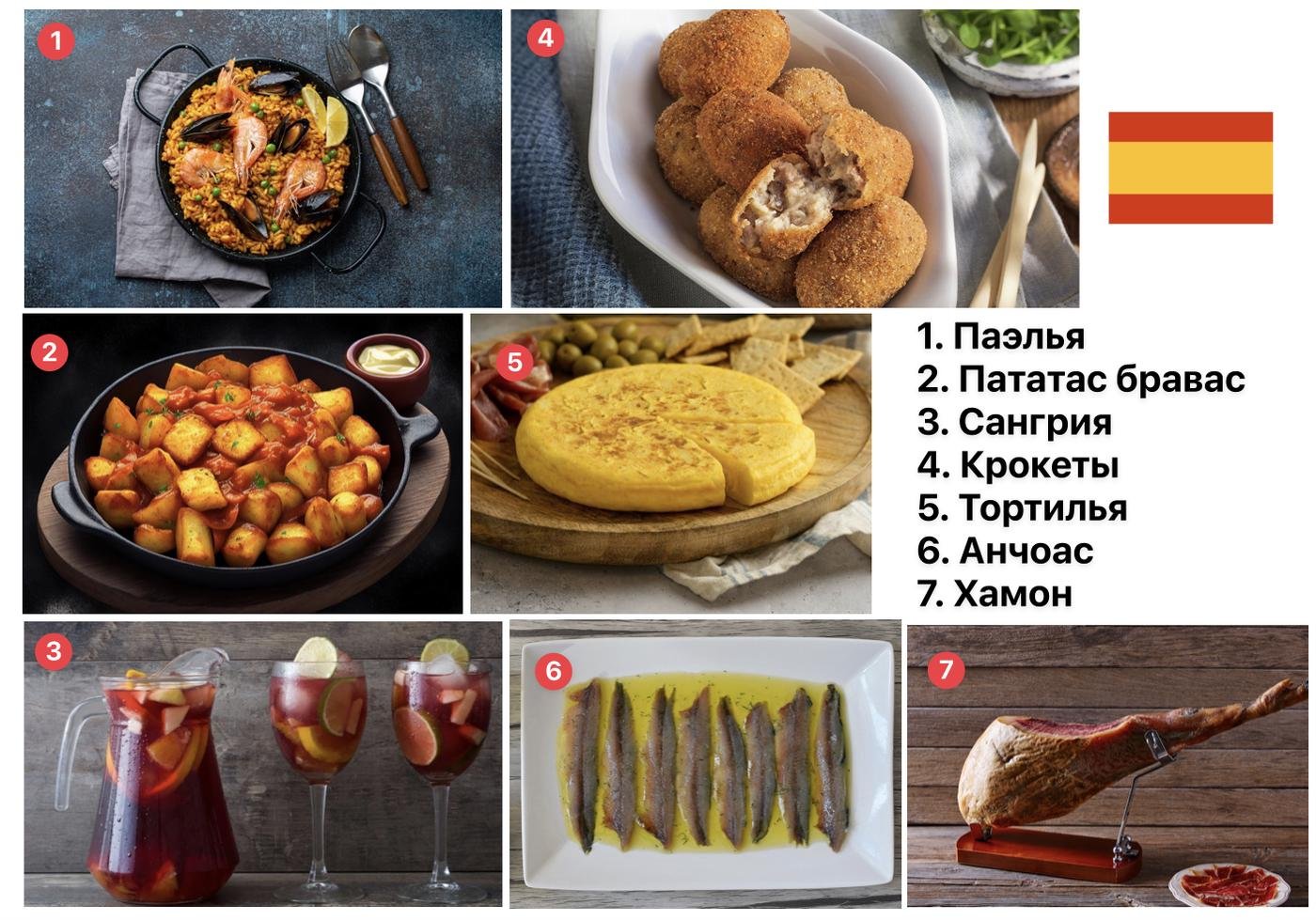 Paella (паэлья/паэйя). Рис со всякими штуками в большой сковороде. Видов много, из классических: валенсийская из курицы и кролика, смешанная (mixta) из мяса и морепродуктов, и чёрная из кальмаров и осьминогов с чернилами каракатицы.