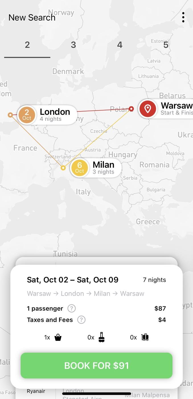 Обратите внимание на режимы "составной маршрут" и "nomad". Последний находит выгодные варианты для, скажем, отпуска, когда вы хотите посетить Лиссабон, Киев и Хельсинки, но вам не важен порядок.
