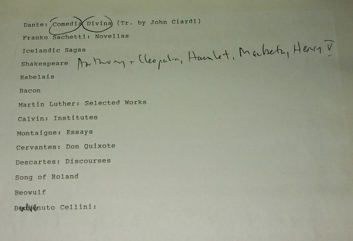 Согласно легенде, однажды, устав от отсутствия литературной эрудиции студентов, он психанул и напечатал список книг на пару листов, без чтения которых на занятия к нему приходить нельзя. Список составлен в примерно хронологическом порядке, начинается с древнейших дошедших до нас литературных текстов Бхагавадгита и Эпос о Гильгамеше, тянется через античность и средневековье, и заканчивается книгами Нового времени, насчитывая 82 пункта.