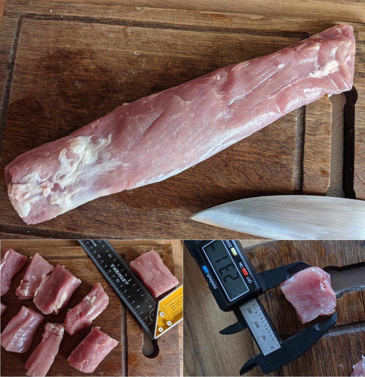 Учитывая форму свиной вырезки, так ее нарезать максимально просто и быстро - распустить вдоль посередине, и полученные колбаски нарезать на порционные калиброванные бруски(профит N3, +10 к продуктивности).
