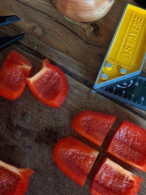 Лук. Тут все макисмально просто - идете на кухню для рыбы берете шаблон для нарезки лука номер 11 и режете. Тут есть момент - лук не надо резать колечками. Причина простая - так неудобно насаживать на шампуры, оно плохо держится, расползается при жарке. Поэтому лук режем на сегменты, используя подручные средства. Нужно получить плоские около квадратные фрагменты - чтобы насаживать на шампуры между брусками мяса.