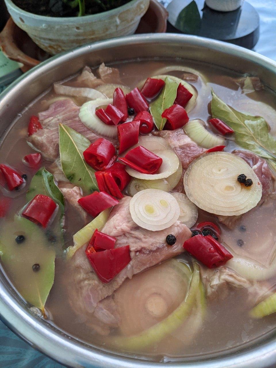 Официально признанный учеными канонический вариант (pubmed.ncbi.nlm.nih.gov/33392575/) -шматки свиной шеи, растительное масло, лук и черный перец - слишком прост, чтобы из него сделать юбилейный пост челенджа.