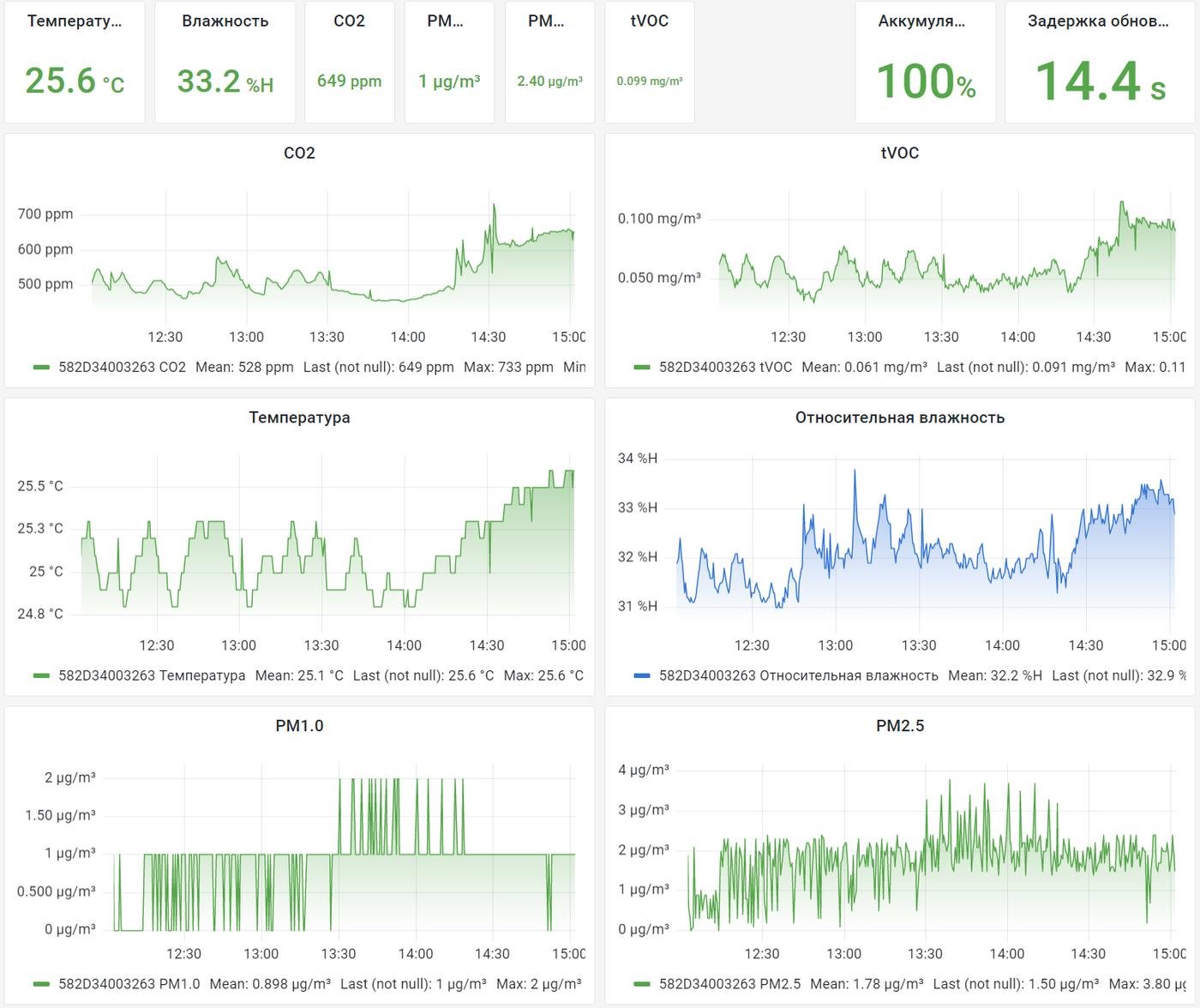 CO2 понятно, не чувствуешь, когда заметно падает, а чугунность головы проветриванием хорошо исправляется. За влажностью обычно мойка воздуха следит, поэтому интересно сравнить с показаниями в другой части комнаты. PM2.5 и TVOC - ну, прикольно, что можно в динамике смотреть, а так вообще нос сам справляется: воняет из окна гарью, закроешь его и сам.