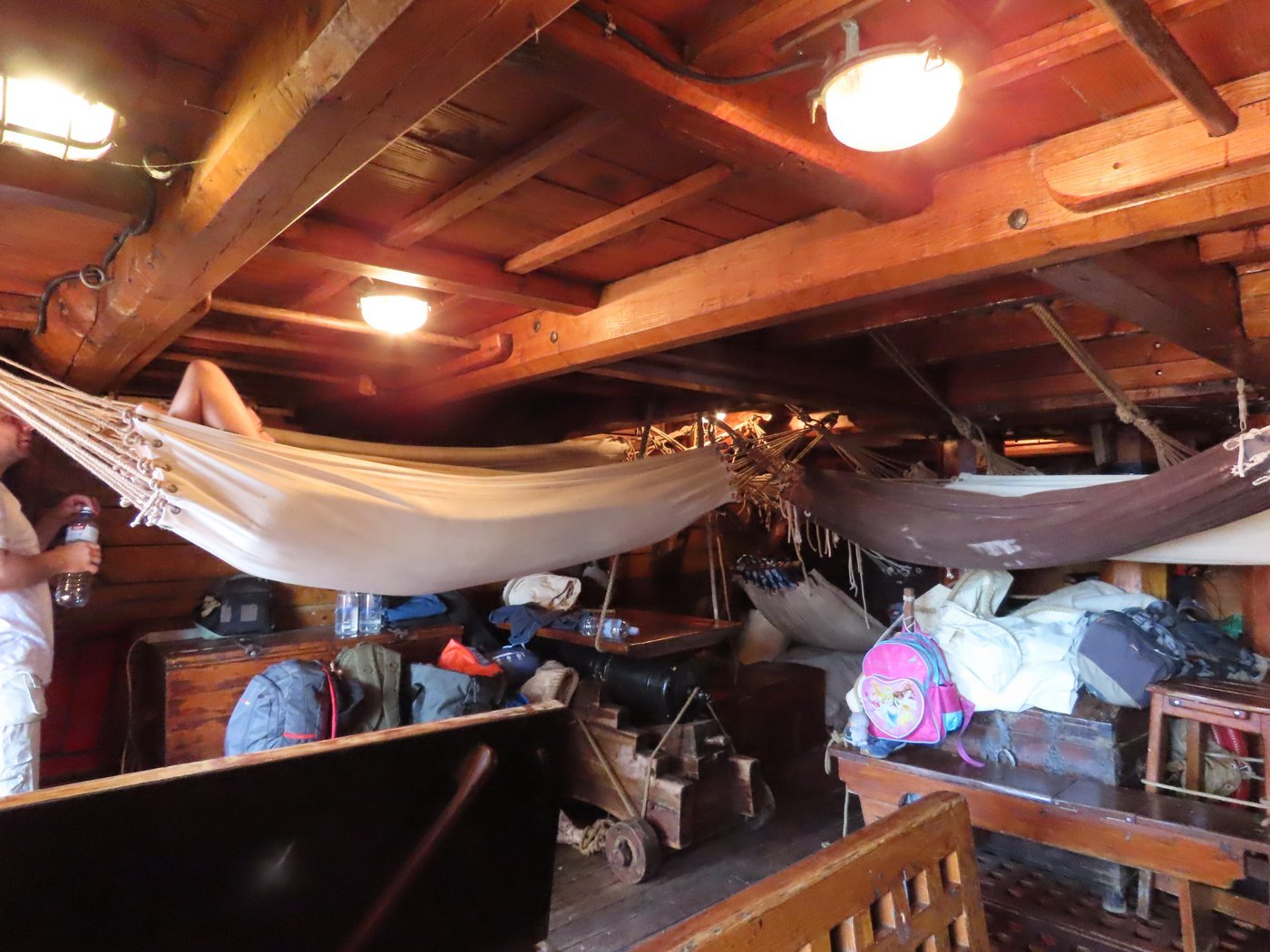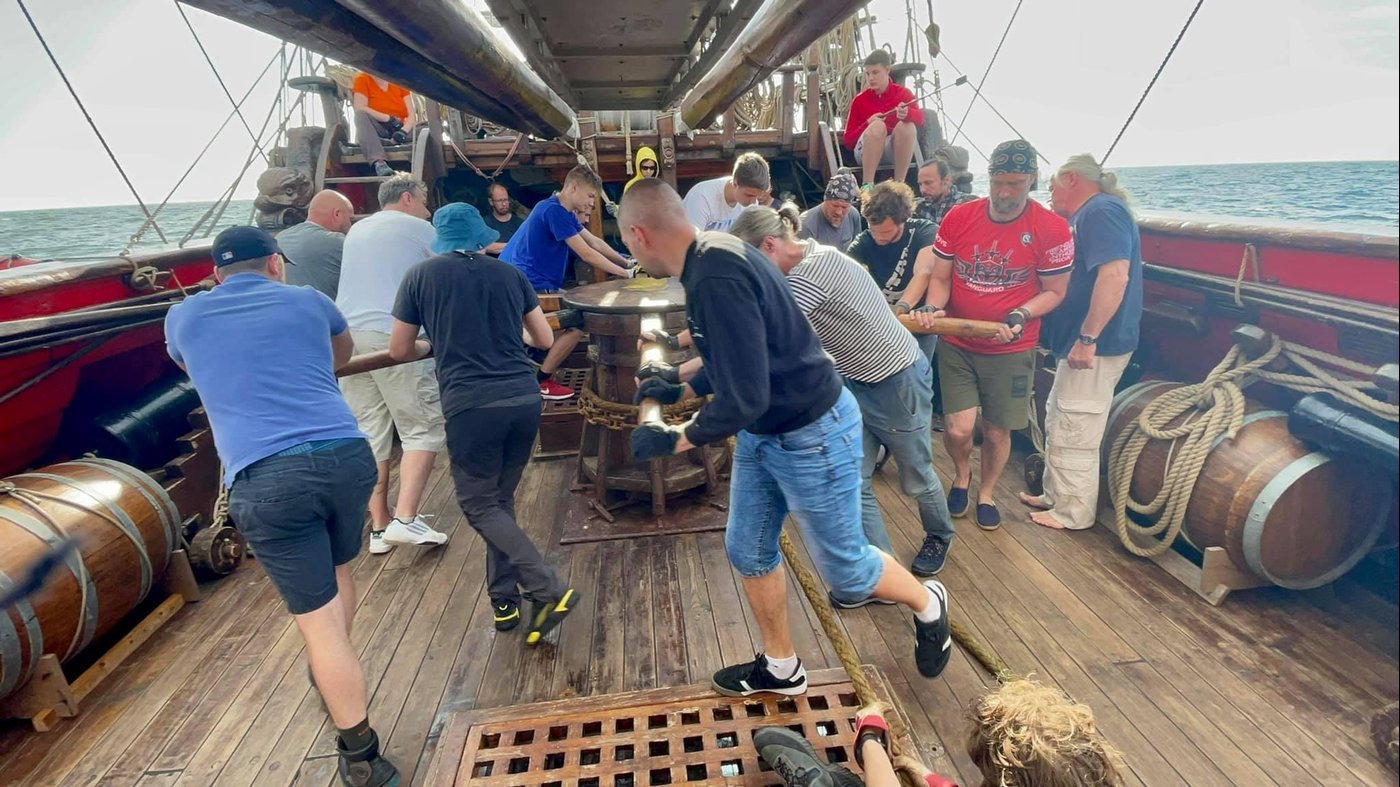 Я опасался заоблачных цен, но нет: трёхдневное плавание к эстонскому острову Рухну и обратно обошлось мне в 300 евро. Если прикинуть средние расходы на один день обычного отпуска и умножить на количество дней, как раз выходит что-то похожее. Надо сказать, я удачно успел: билеты разобрали очень быстро, уставшие от бесконечного локдауна рижане соскучились по развлечениям. В итоге экипажу пришлось развесить в кубрике дополнительные гамаки, потому что на борт набилось 37 человек (обычно, насколько я понимаю, бывает не больше 30). Особой тесноты, впрочем, всё равно не было: оригинальный «Штандарт» Петра Первого был рассчитан на 150 человек экипажа. Вот им, я думаю, было действительно тесновато.