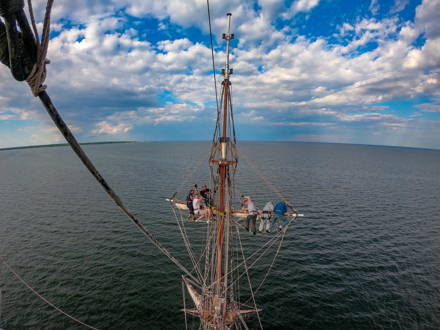 Самое интересное, конечно, это работа с парусами. Она бывает двух типов: тянуть верёвку, стоя на палубе (вахтенный офицер скажет, какую и куда, но к третьему дню начинаешь уже понемногу их различать и сам) и вязать узлы, забравшись на рею. Для работы на реях используется альпинистская страховочная обвязка, так что жизнь твоя будет в безопасности, но вот адреналина ты получишь по полной программе!