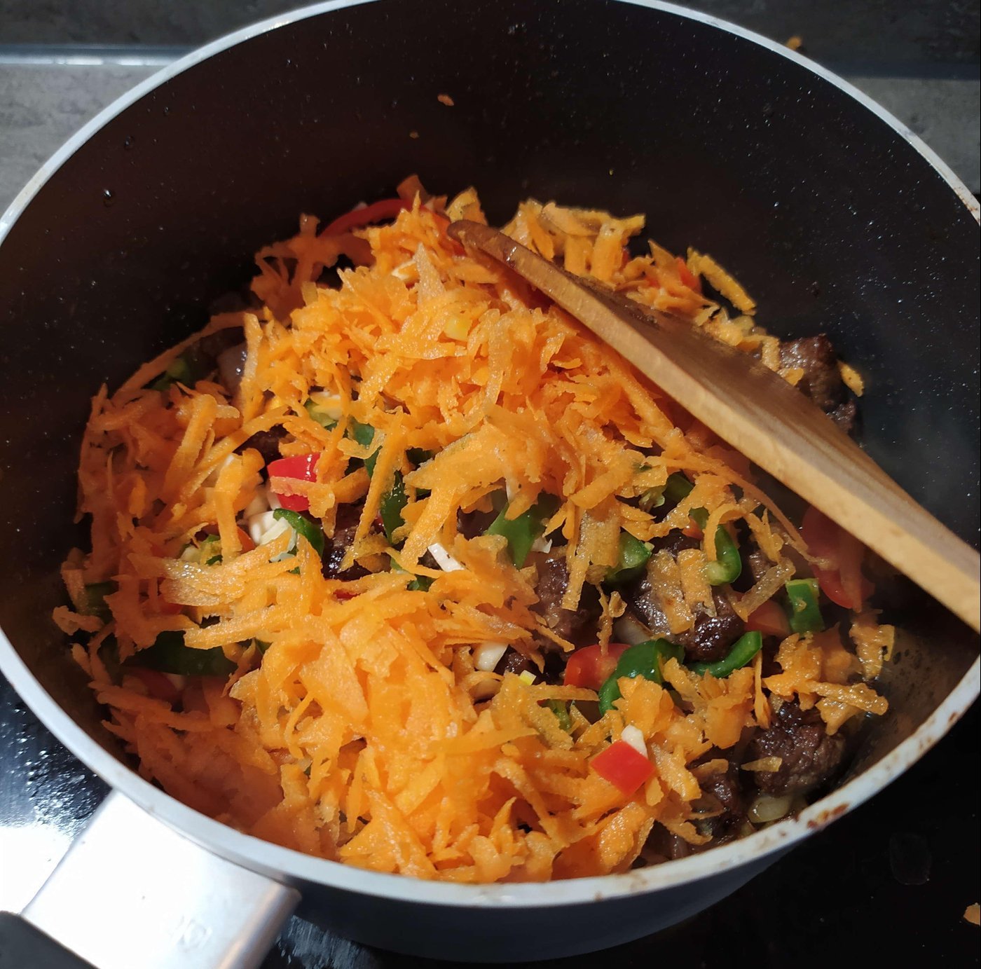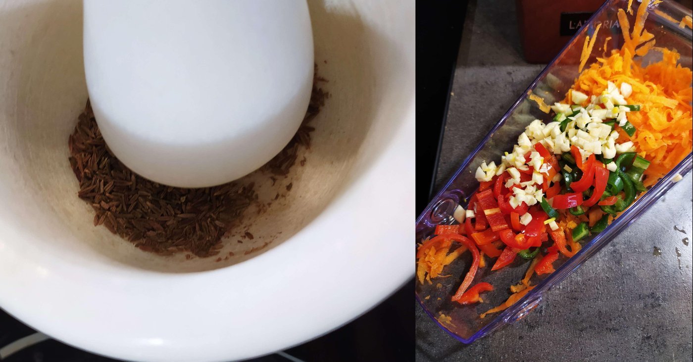 Пока жарится мясо можно растереть зиру в ступке (или руками), трем морковку (на крупной терке), режем перчики и чеснок.