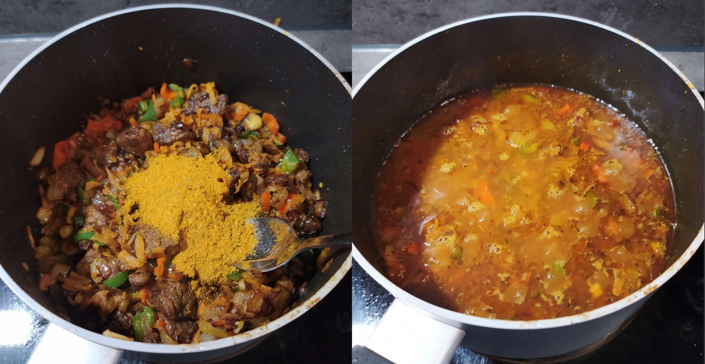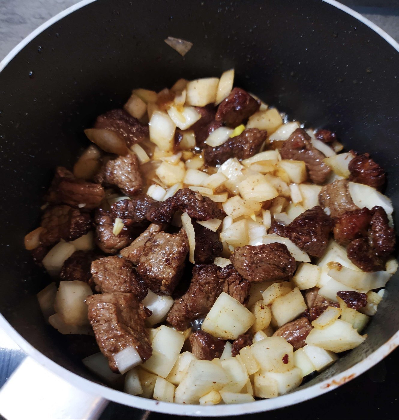 Закидываем специи, солим половиной соли, наливаем воды (горячей), чтобы покрывало на пару сантиметров, закрываем крышку и оставляем на небольшом огне тушиться на где-то час.