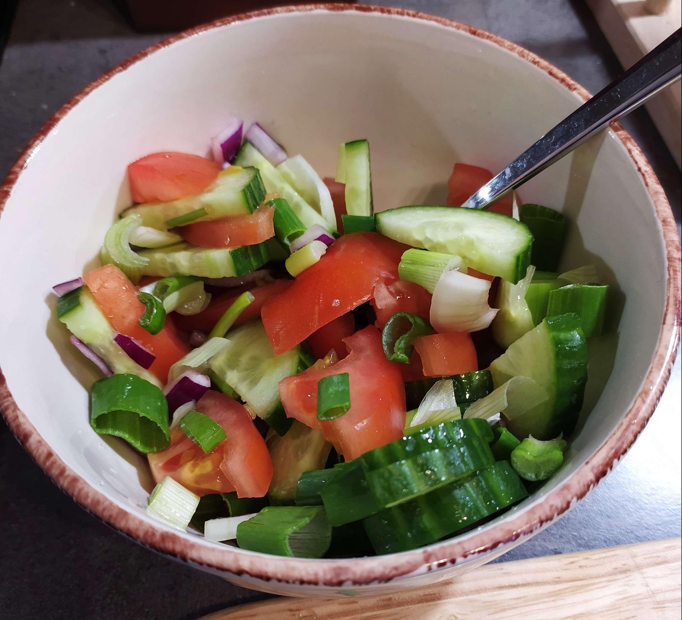 Перемешиваем, и подаем вместе с овощным салатом и чайником чая.