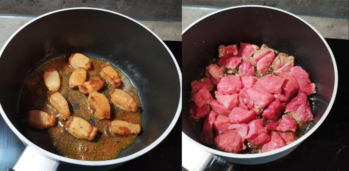 Как только шкварки готовы - достаем и кидаем порезанное кубиками мясо. Мясо выделит много влаги - выпариваем на сильном огне, помешиваем, ждем пока обжарится до корочки.