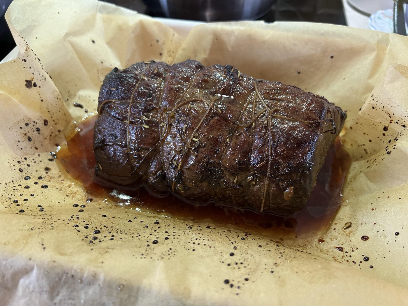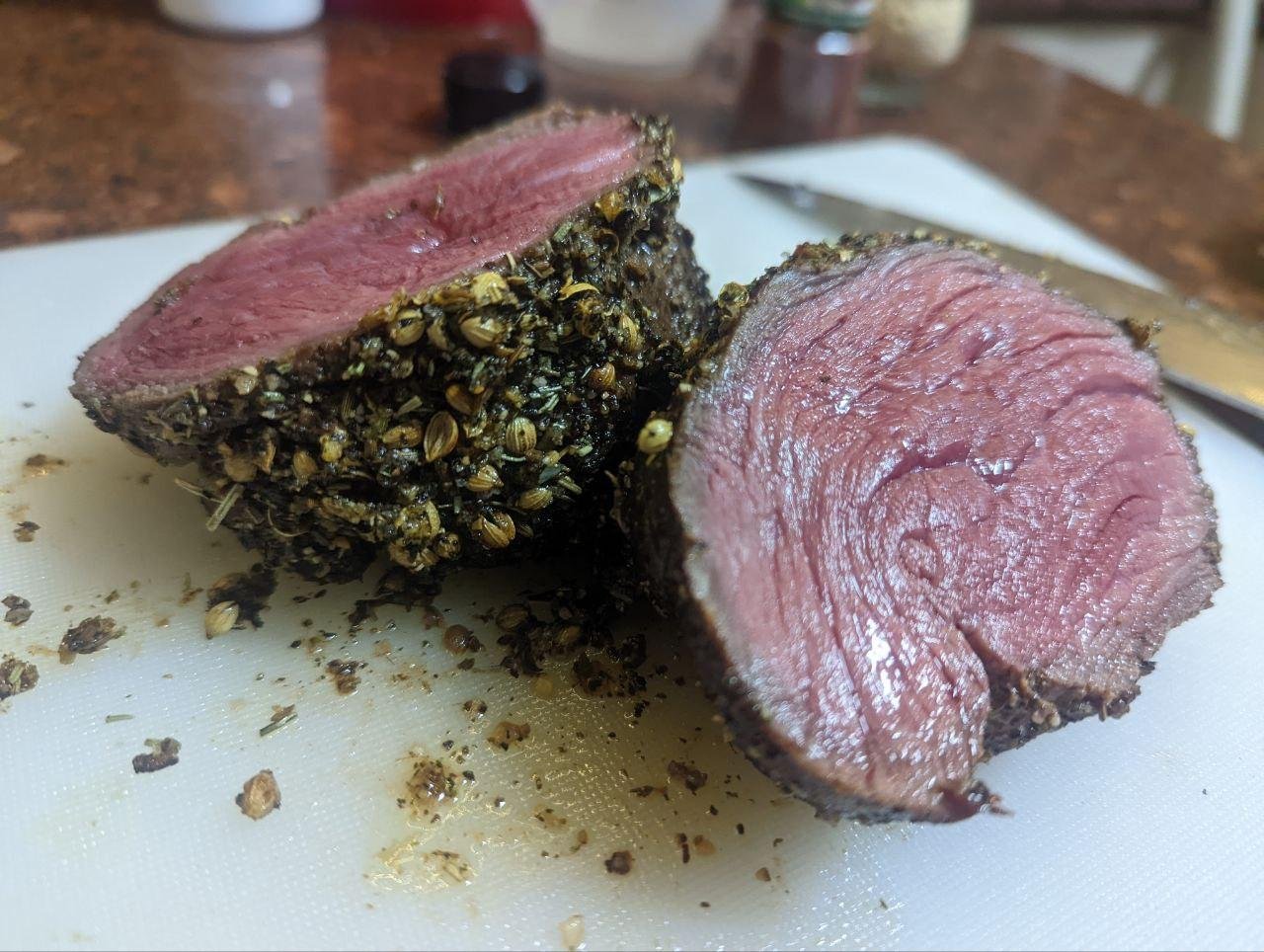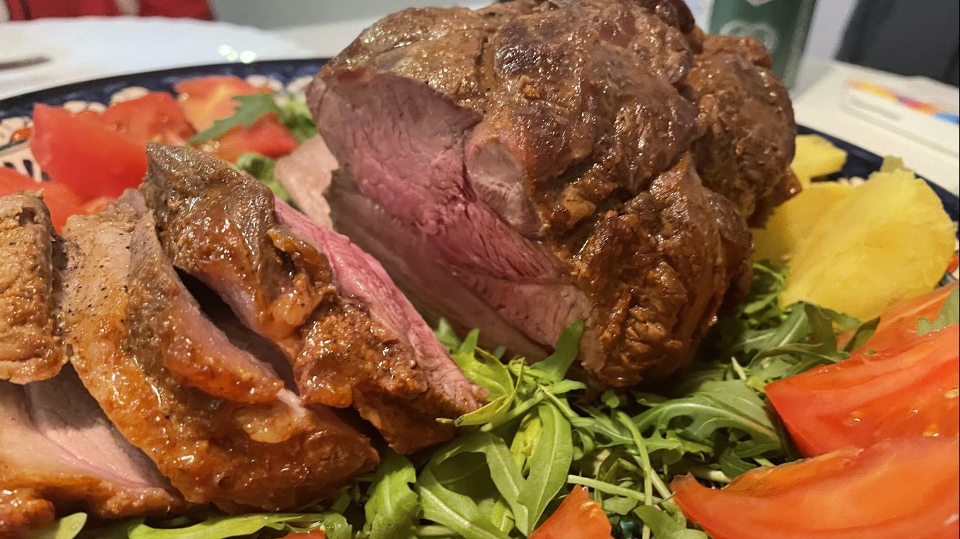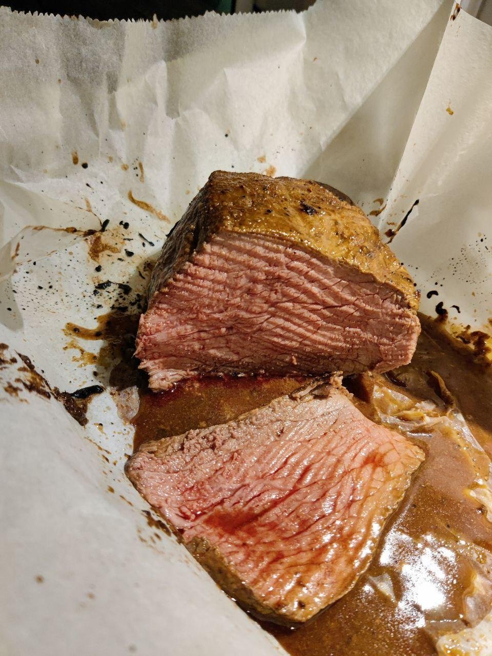 Рецепт огонь, @smyachenkov делился им уже в клубе и время для готовки из рассчета 40 минут на 1 кг. В этот раз я делал с термометром, мясо дошло до 66 градусов и получилось очень круто и вкусно.