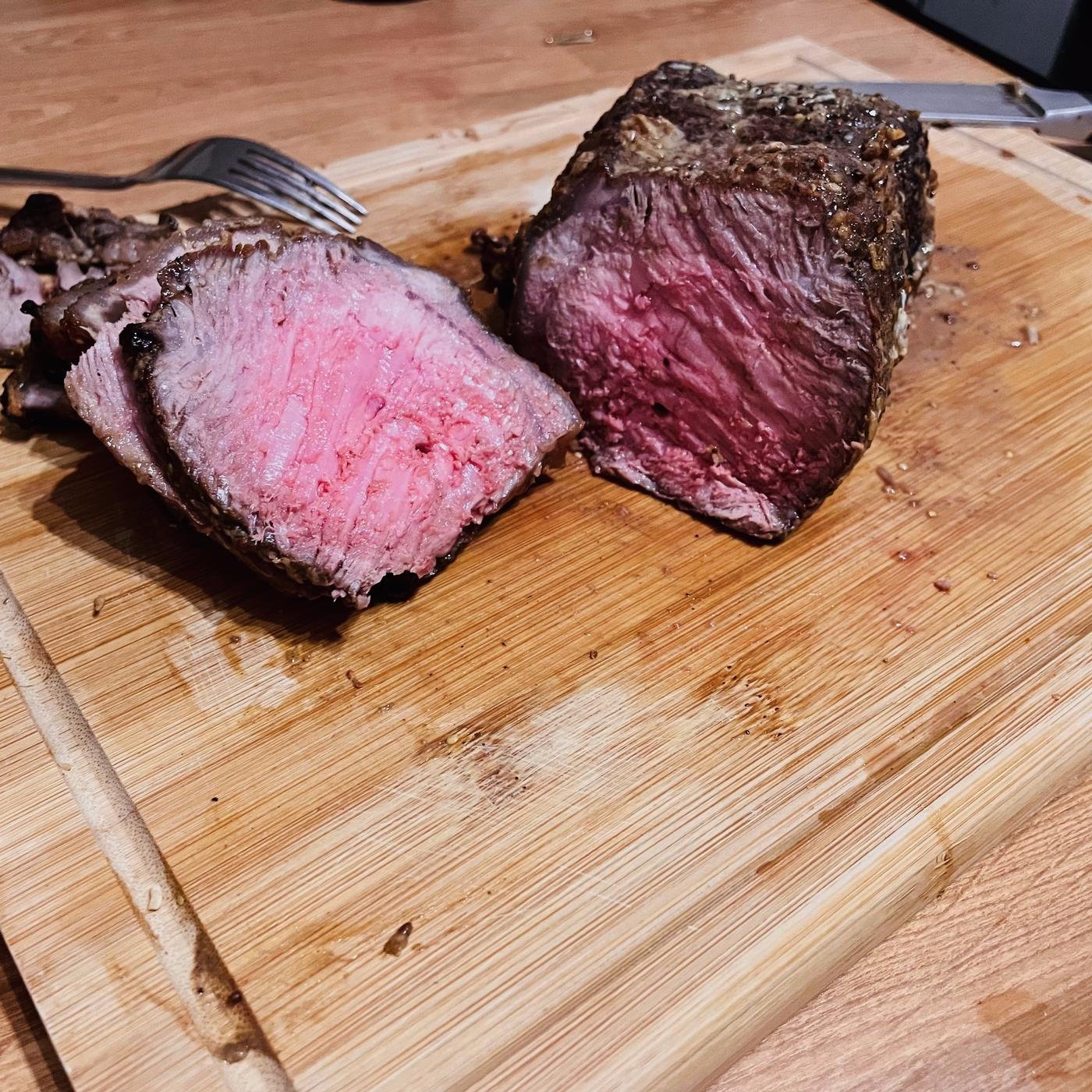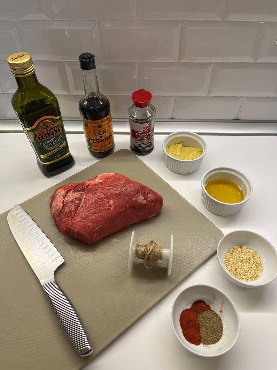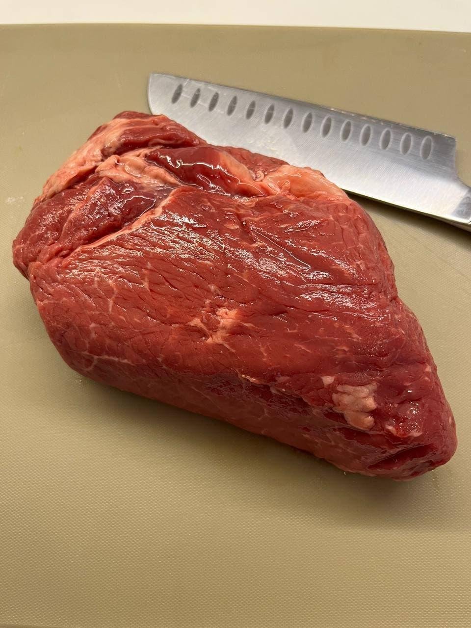 Ищите цельный кусок 700г-1.5кг. Не берите очень плоские вырезы или порционные стейки, ищите соотношение сторон 3длина:1:высота:1ширина. Плоский кусок за время готовки потеряет весь сок, а мы целимся в красный сочный центр. Хорошие вырезки — sirloin, prime rib, tenderloin. Но вообще сделать можно из любого отруба. Смотрите на куски с меньшим объемом жира — у нас не slow cooking, где надо растамливать до волокон.
