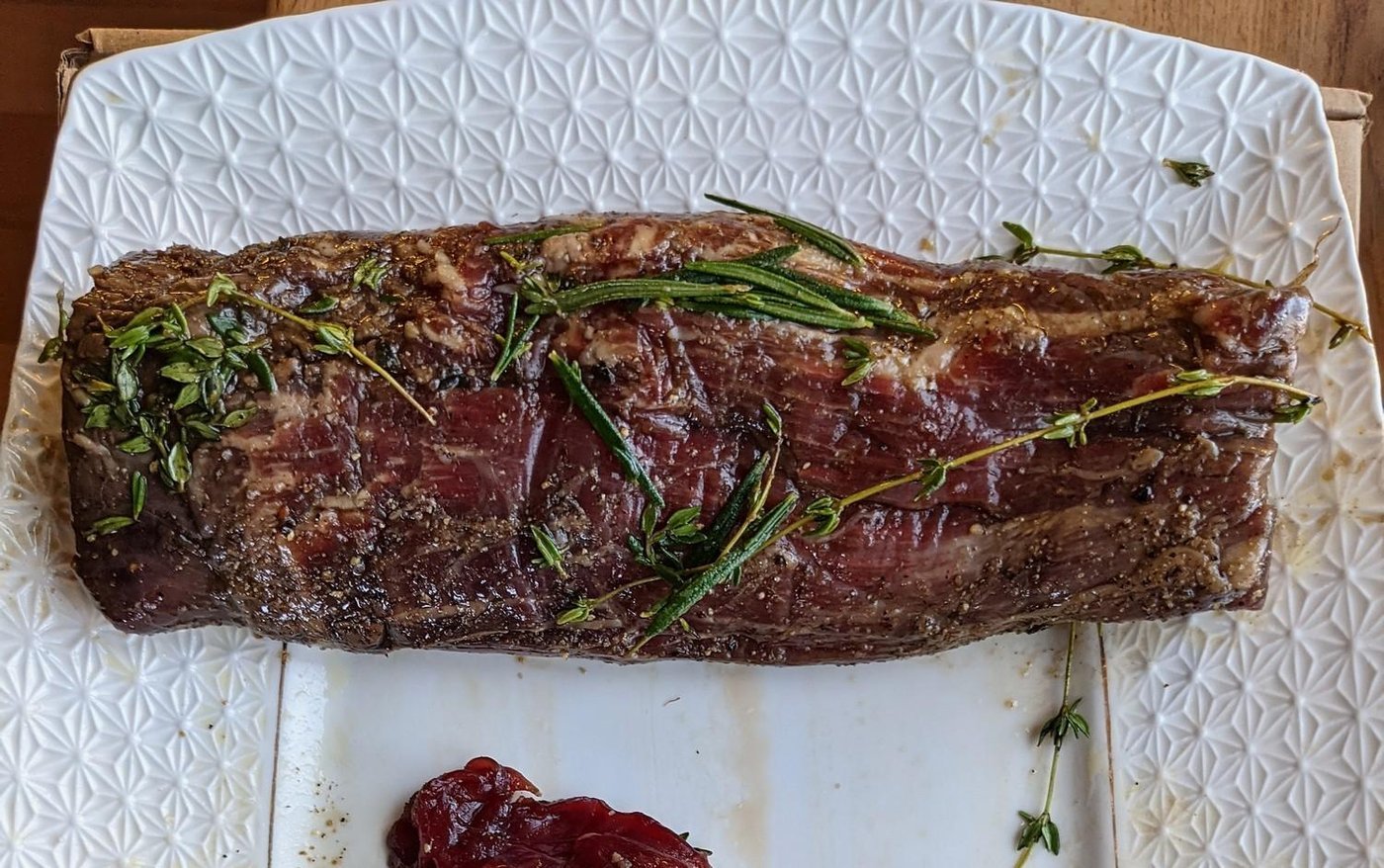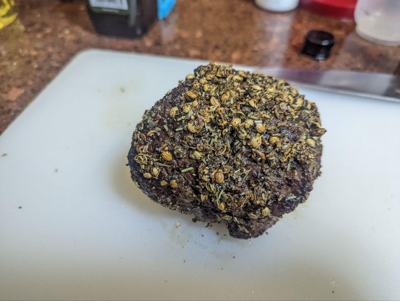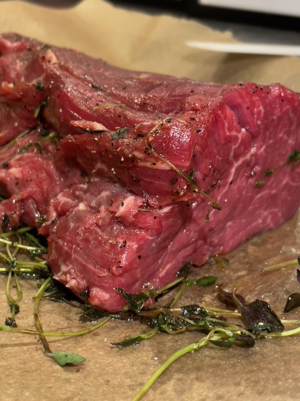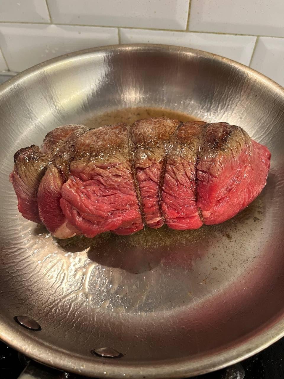 Ищите цельный кусок 700г-1.5кг. Не берите очень плоские вырезы или порционные стейки, ищите соотношение сторон 3длина:1:высота:1ширина. Плоский кусок за время готовки потеряет весь сок, а мы целимся в красный сочный центр. Хорошие вырезки — sirloin, prime rib, tenderloin. Но вообще сделать можно из любого отруба. Смотрите на куски с меньшим объемом жира — у нас не slow cooking, где надо растамливать до волокон.