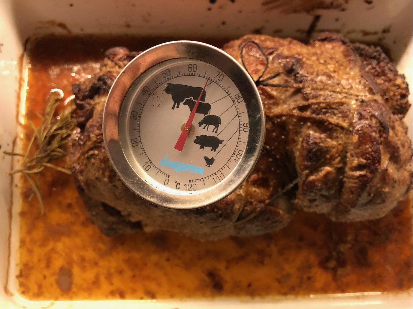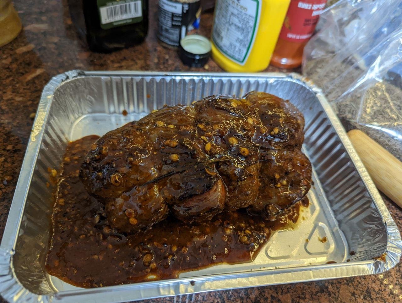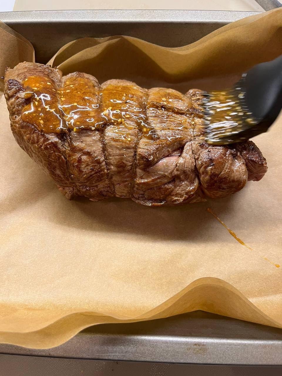 Почти полтора кило говядины (далеко не идеальный отруб, но уж что удалось добыть) замариновала на 4 часа (соль, перец, оливковое масло, вустерский соус), потом связала, запечатала на сковороде со всех сторон и уложила в керамический лоток. Обмазала смесью горчицы, мёда и прочего разного, воткнула термометр и отправила в духовку на 180°.