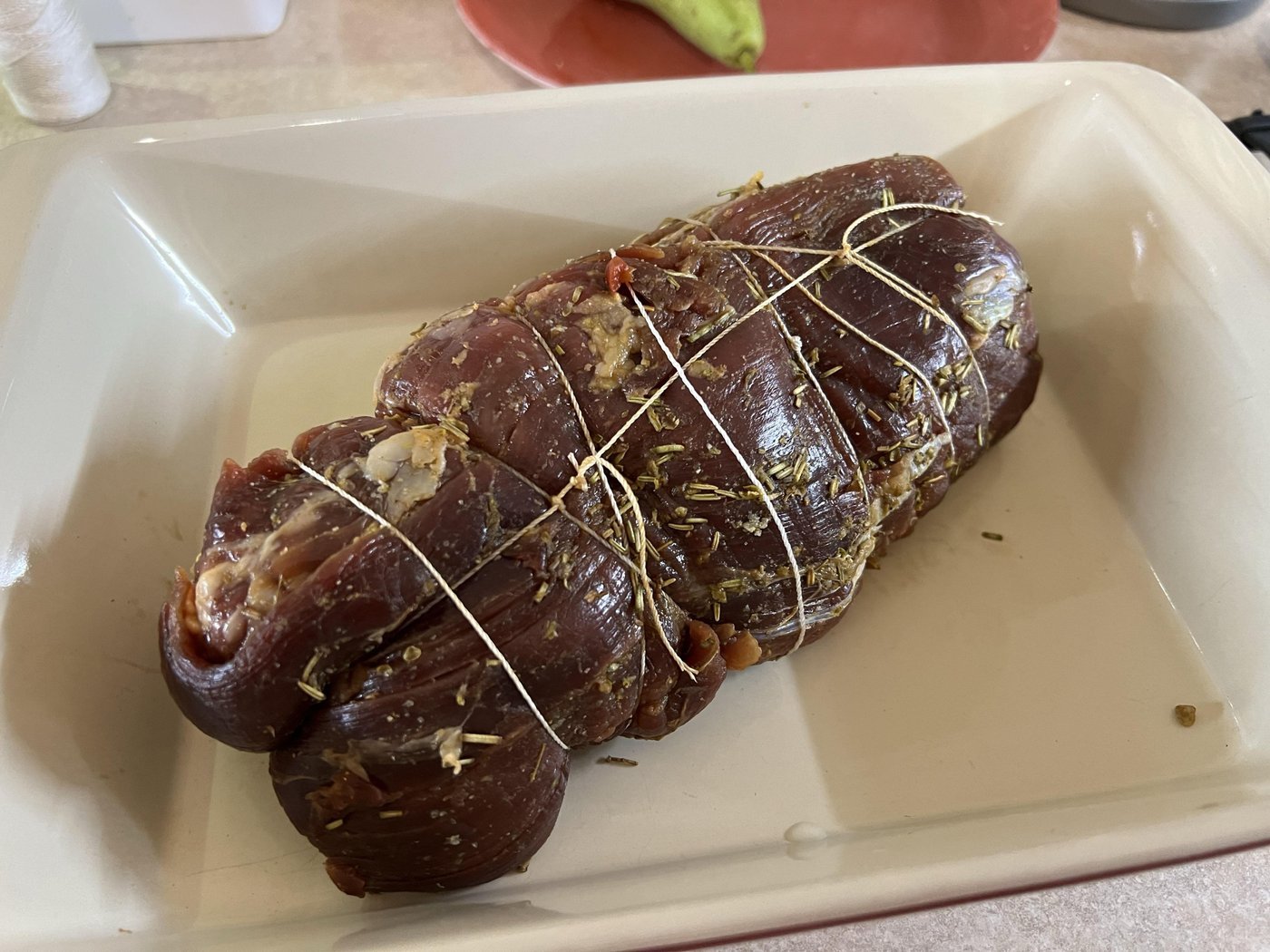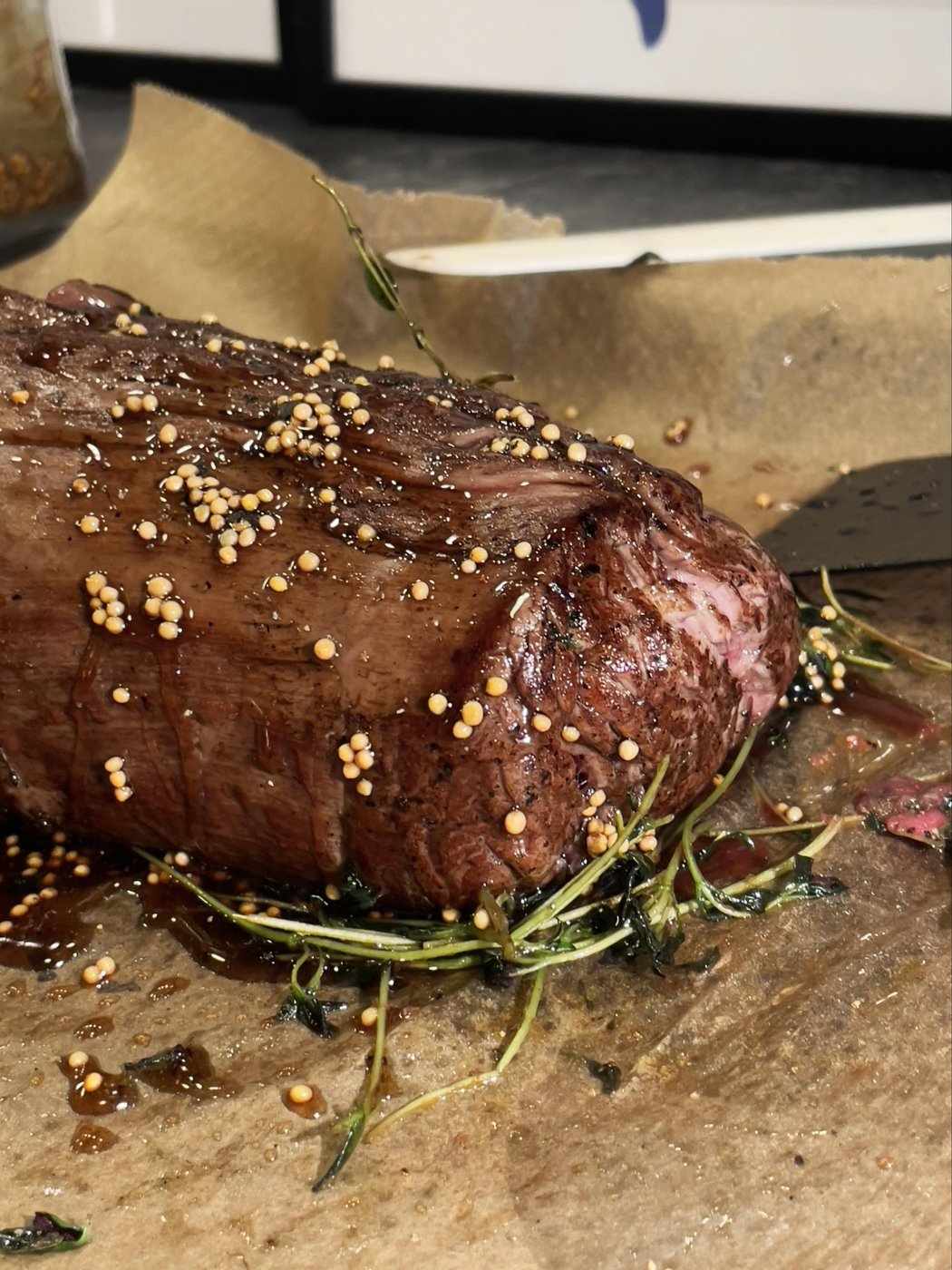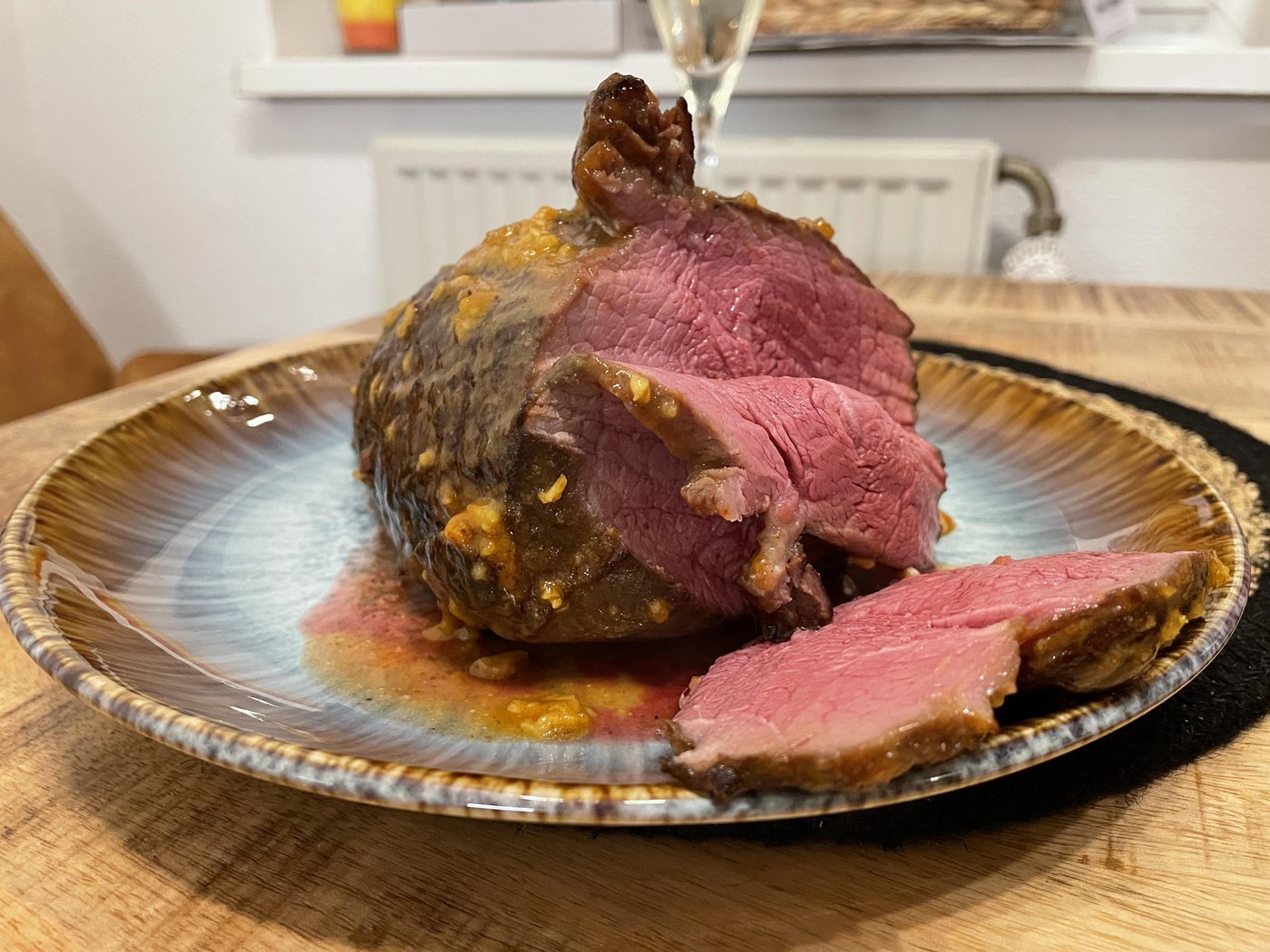 Почти полтора кило говядины (далеко не идеальный отруб, но уж что удалось добыть) замариновала на 4 часа (соль, перец, оливковое масло, вустерский соус), потом связала, запечатала на сковороде со всех сторон и уложила в керамический лоток. Обмазала смесью горчицы, мёда и прочего разного, воткнула термометр и отправила в духовку на 180°.