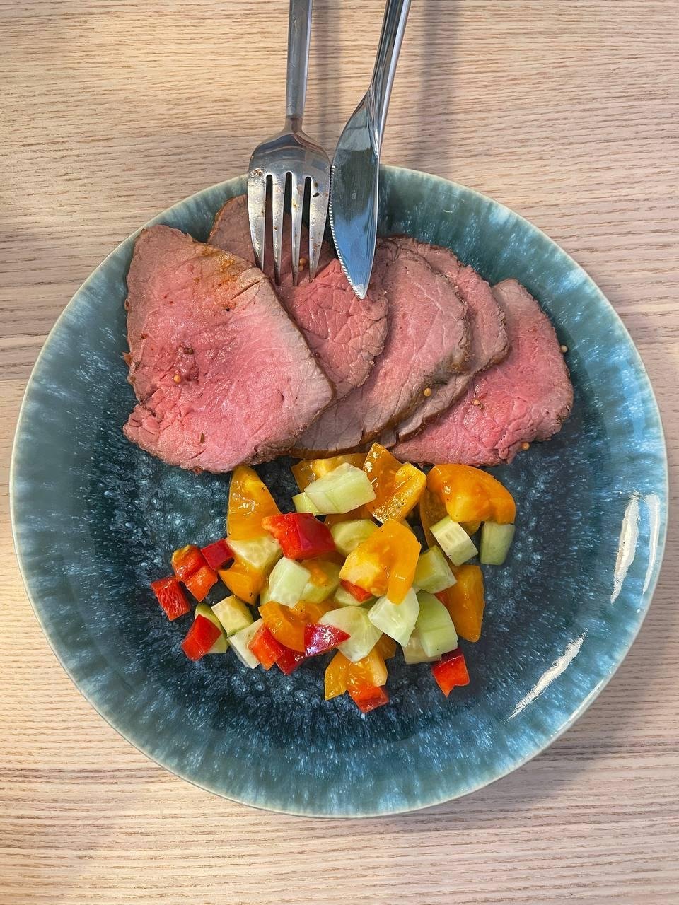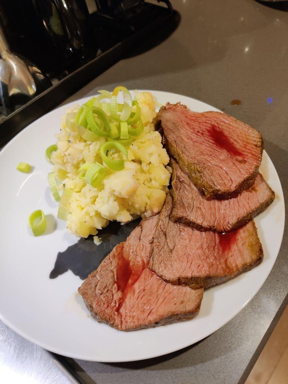 Мясо получилось очень нежным, похоже на medium rare. Подавал его с салатиком и все было скушано уже через 20 минут =)