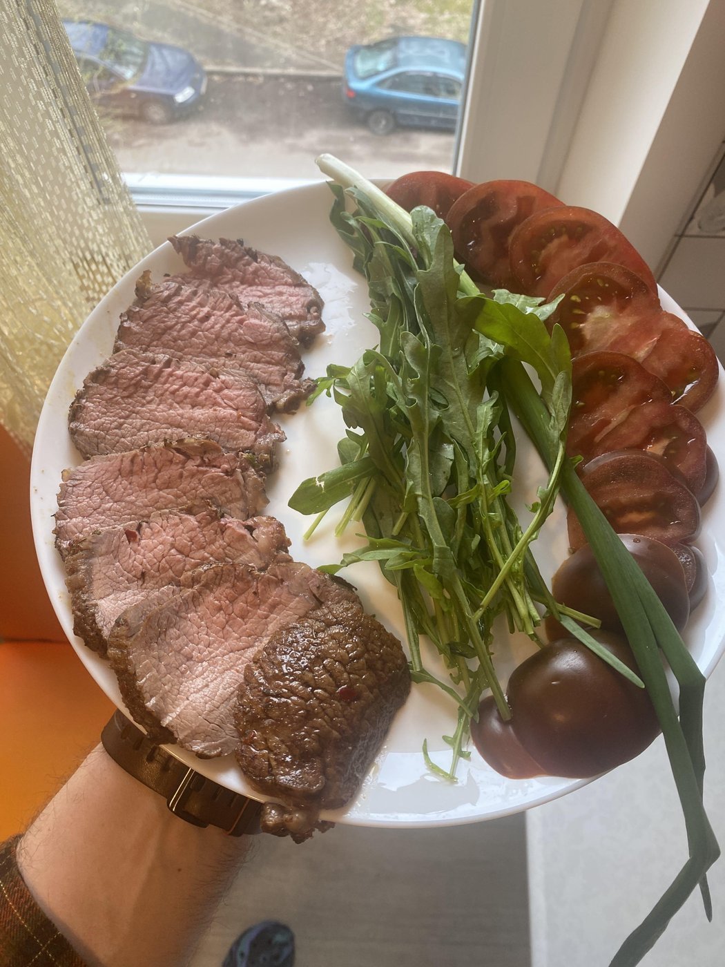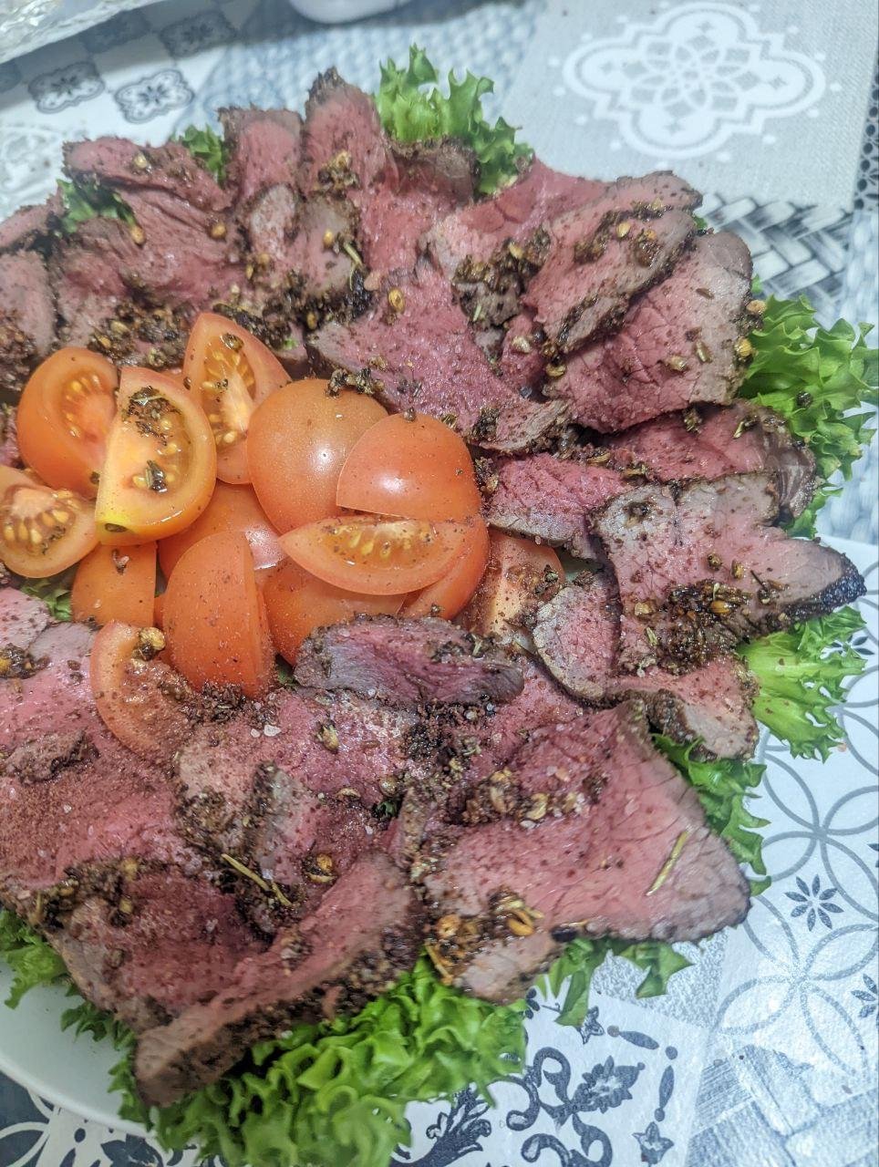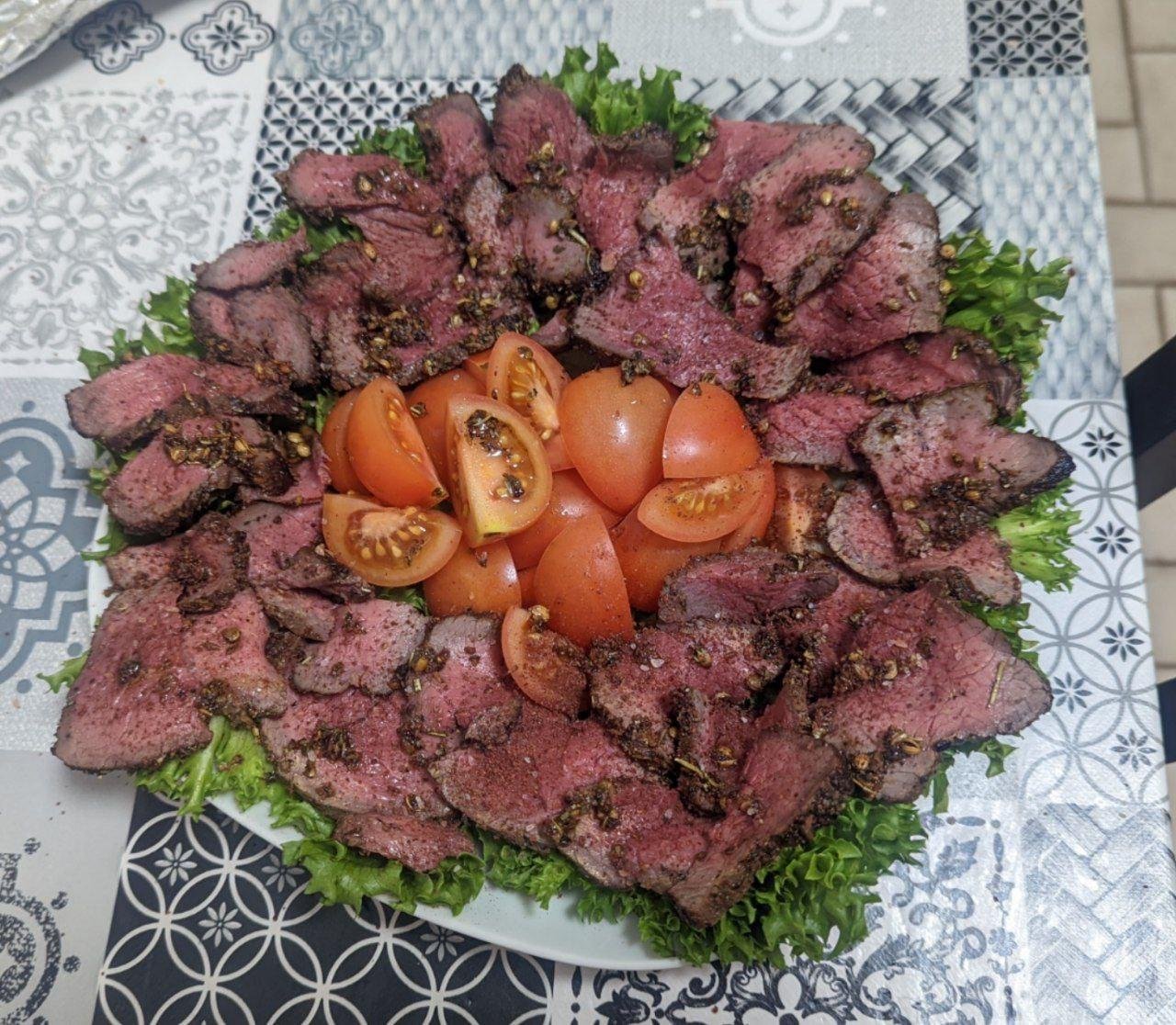 Мой любимый вариант сервировки: ростбиф, руккола, томаты