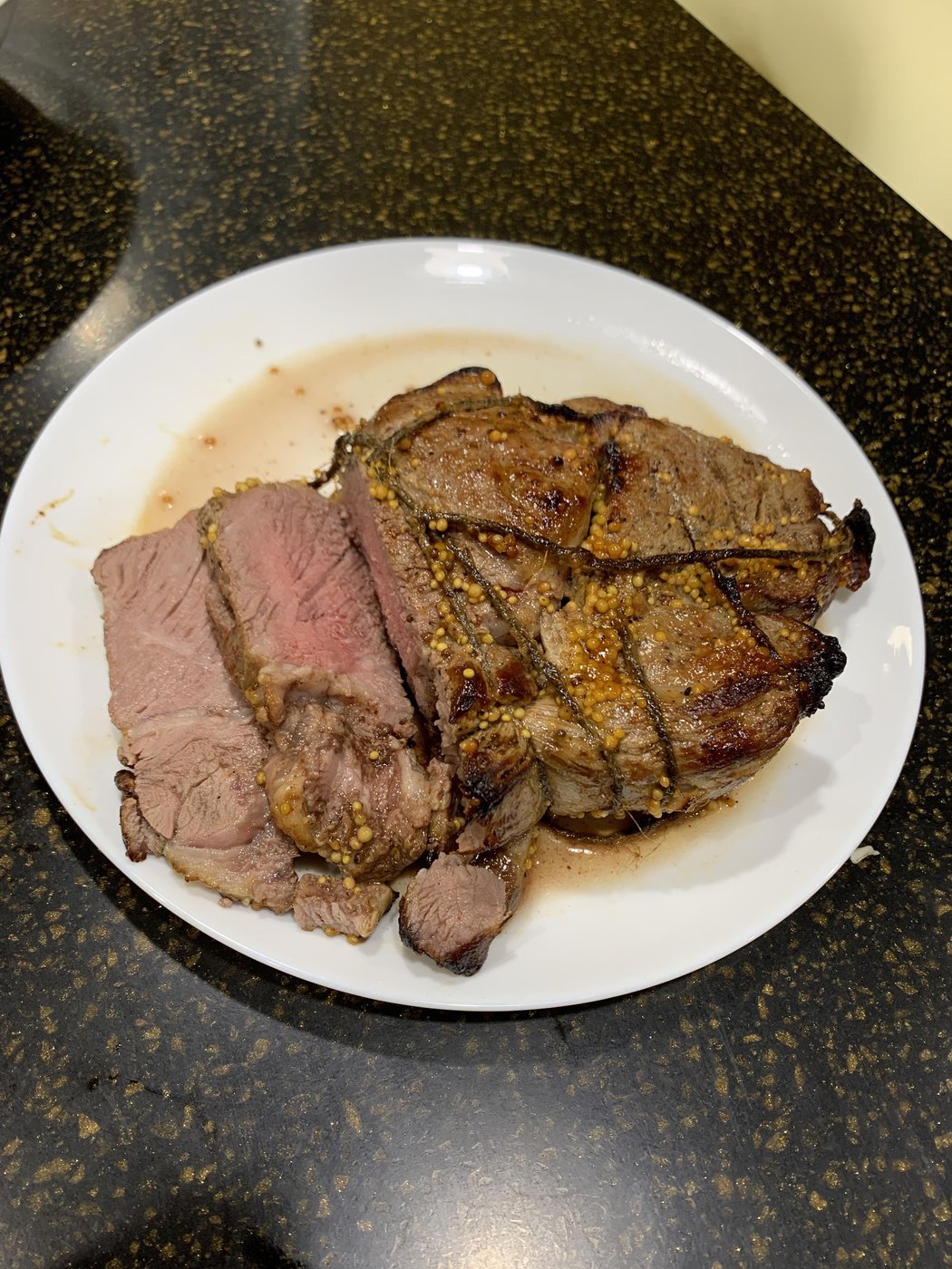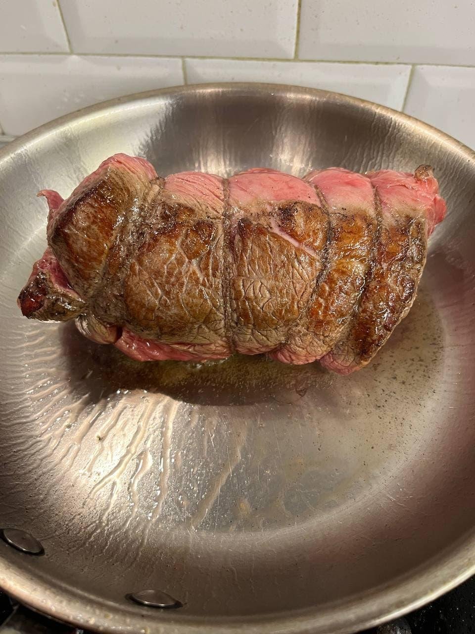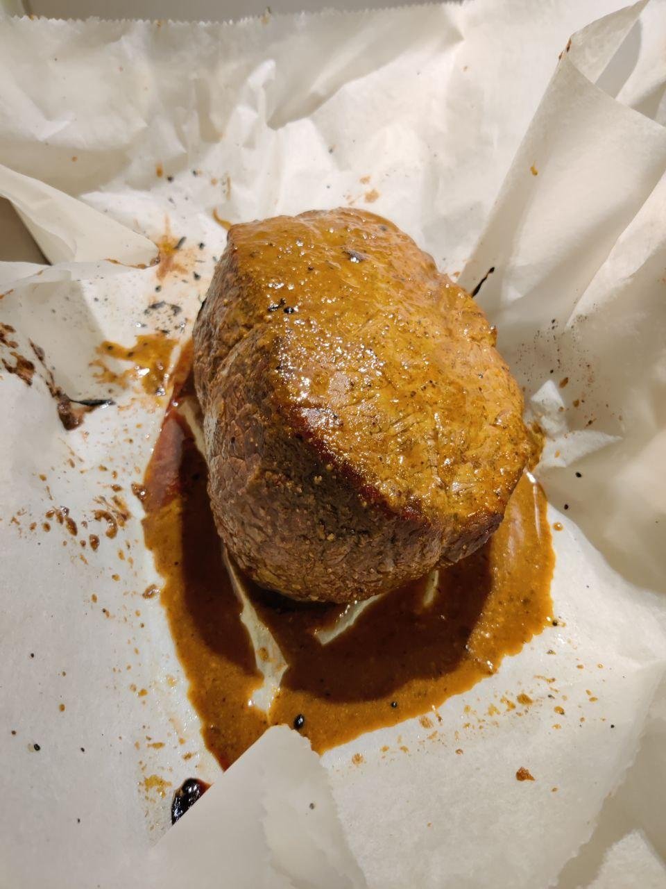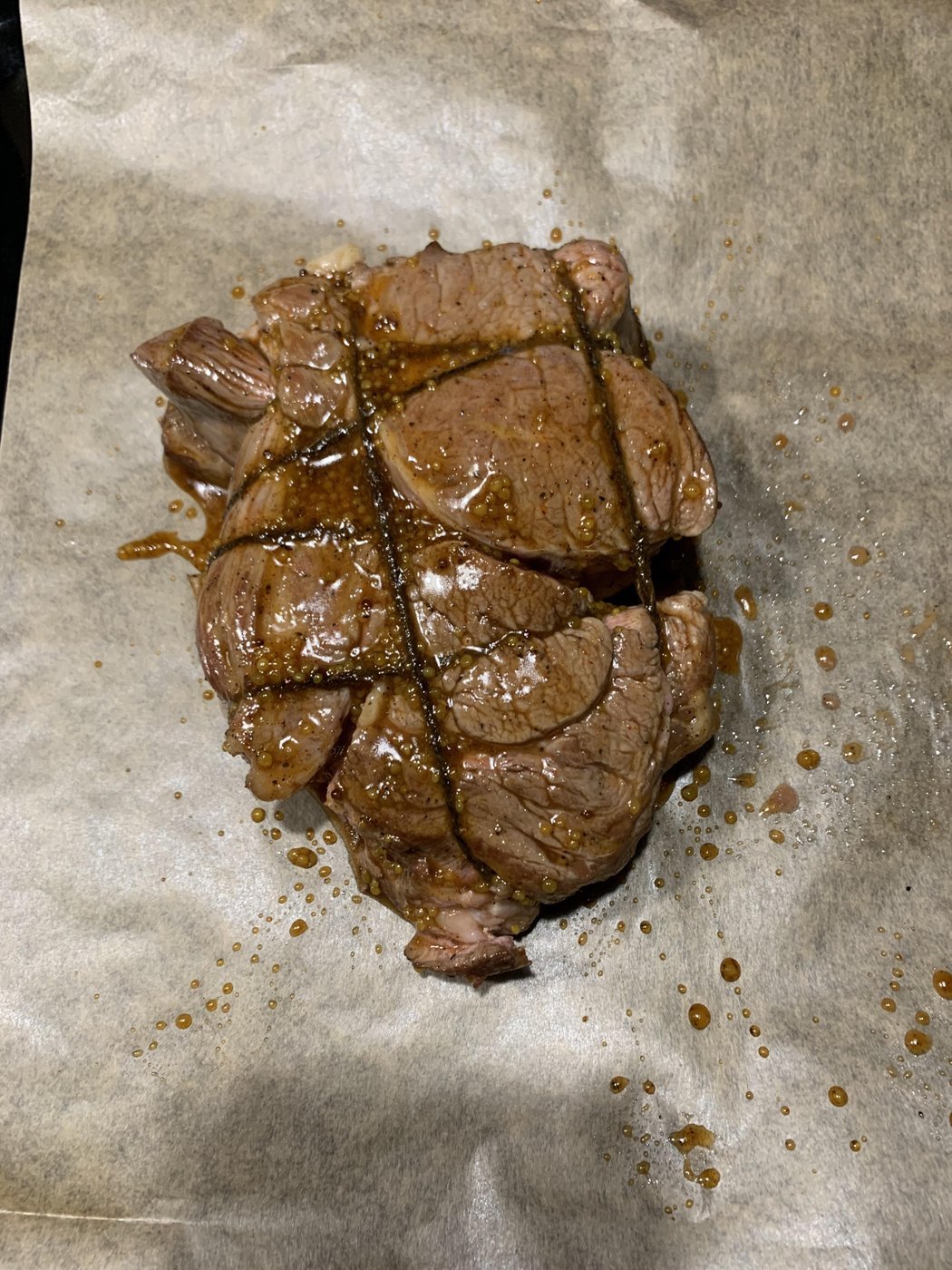 Штош, готовил в сувиде 4 часа при 58 градусах вообще без специй/маринада (возможно зря), затем дал отдохнуть пол часика, обжарил в сливочном масле по 30 сек с каждой стороны, и наконец залил это дело медово-горчичным соусом запек 20 минут в духовке, дабы получить вкусную корочку.