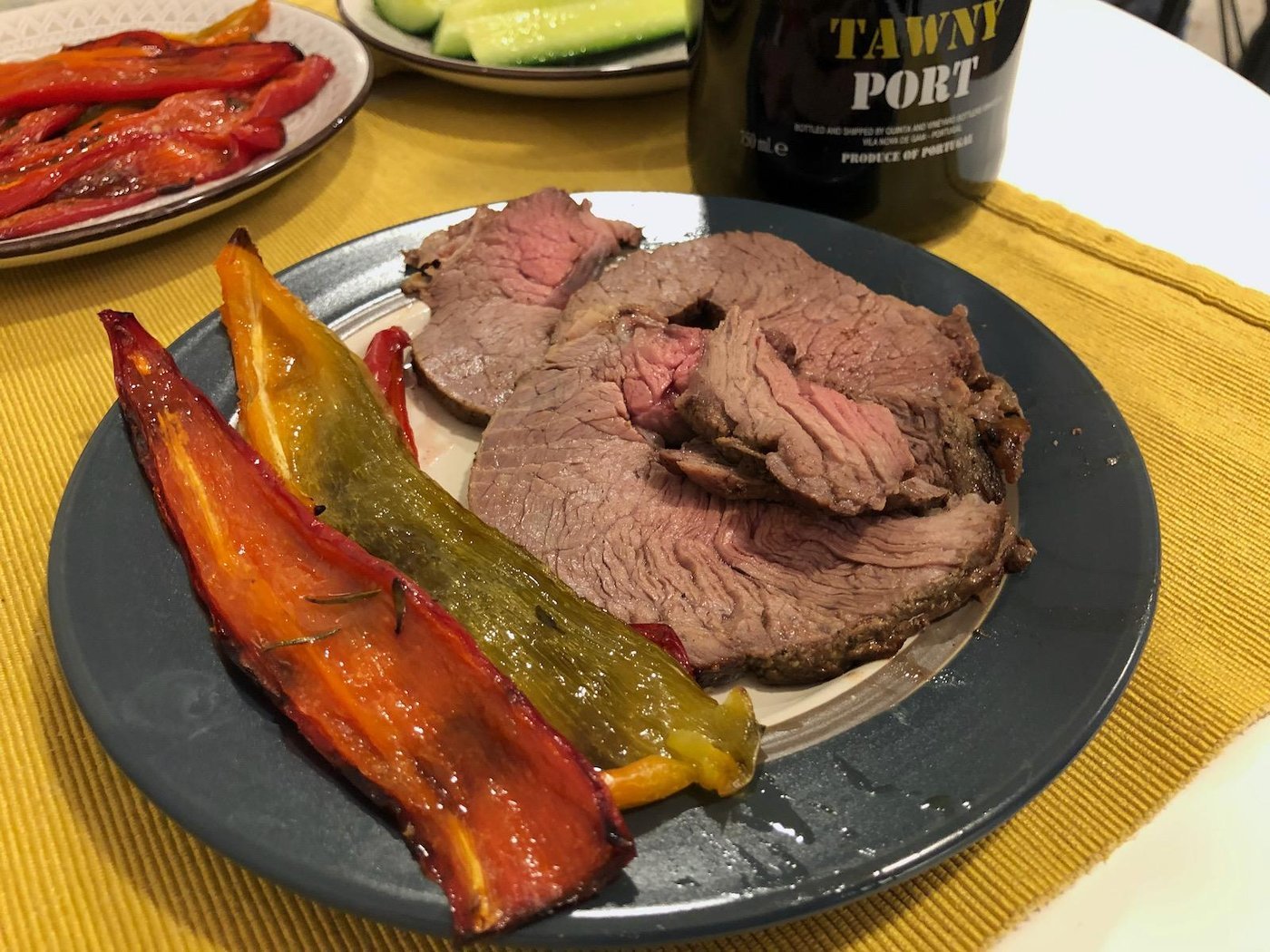 Мясо брал обычную вырезку, мариновал в травах, горчице и гранатовом соусе. Немного передержал, но кроме меня в семье медиум прожарку никто не любит, так что пришлось к столу. Для завершения после духовки подержал под фольгой где-то 20 минут и сервировал сладким перцем, приготовленным на гриле.
