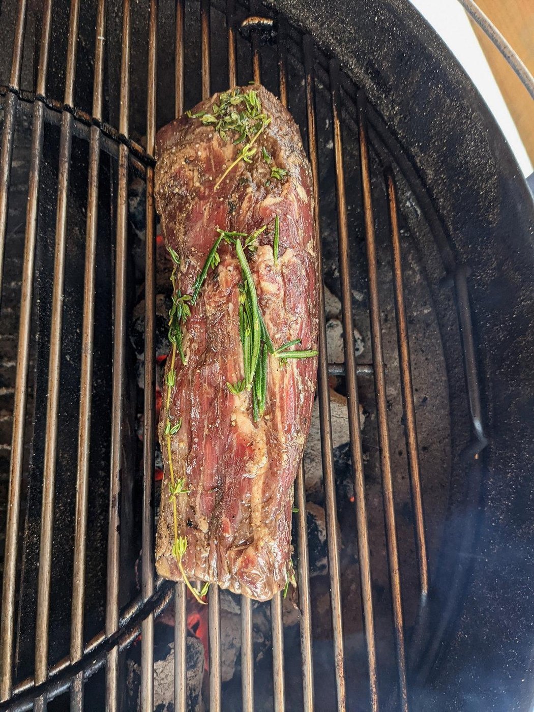 потом на непрямой жар до готовности (по термометру). для такой тощенькой вырезки, как в этот раз, вышло около 20 мин на непрямом.