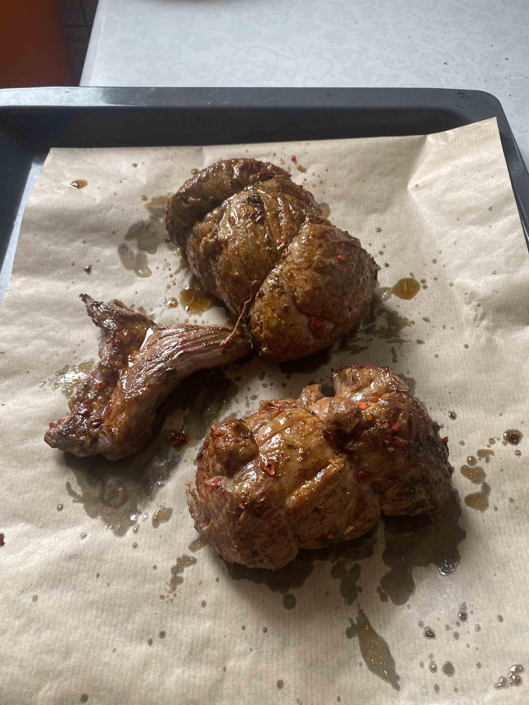 Предварительно замариновал мясо в тимьяне/розмарине/укропе/перце на часов 15. Дальше обжарил, обмазал маринадом и в духовку.