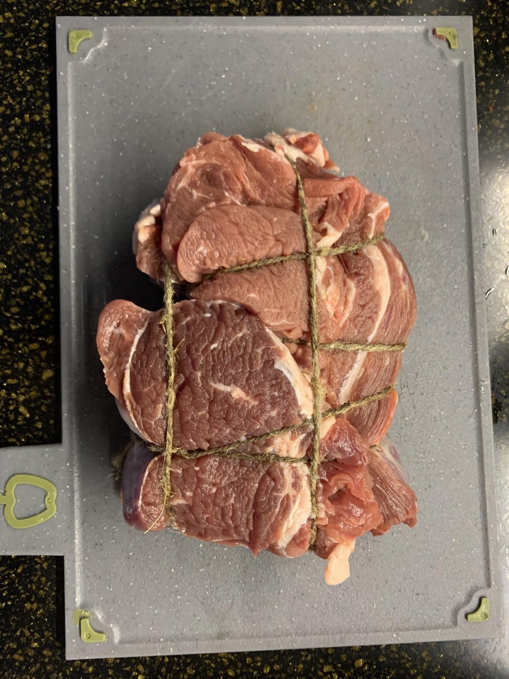 - Связываем мясо бечевкой или толстыми нитками. Это нужно чтобы кусок держал форму и не растекался/расплющивался. В таком случае сок не будет уходить из середины.