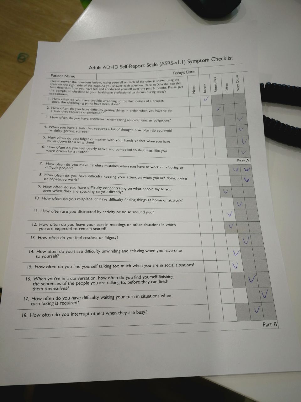 Не знаю какая у меня степень СДВГ, но в какой-то мере точно есть. Мне повезло и я сам с этим справляюсь не смотря на большую часть положительных ответов в приведённом тесте.