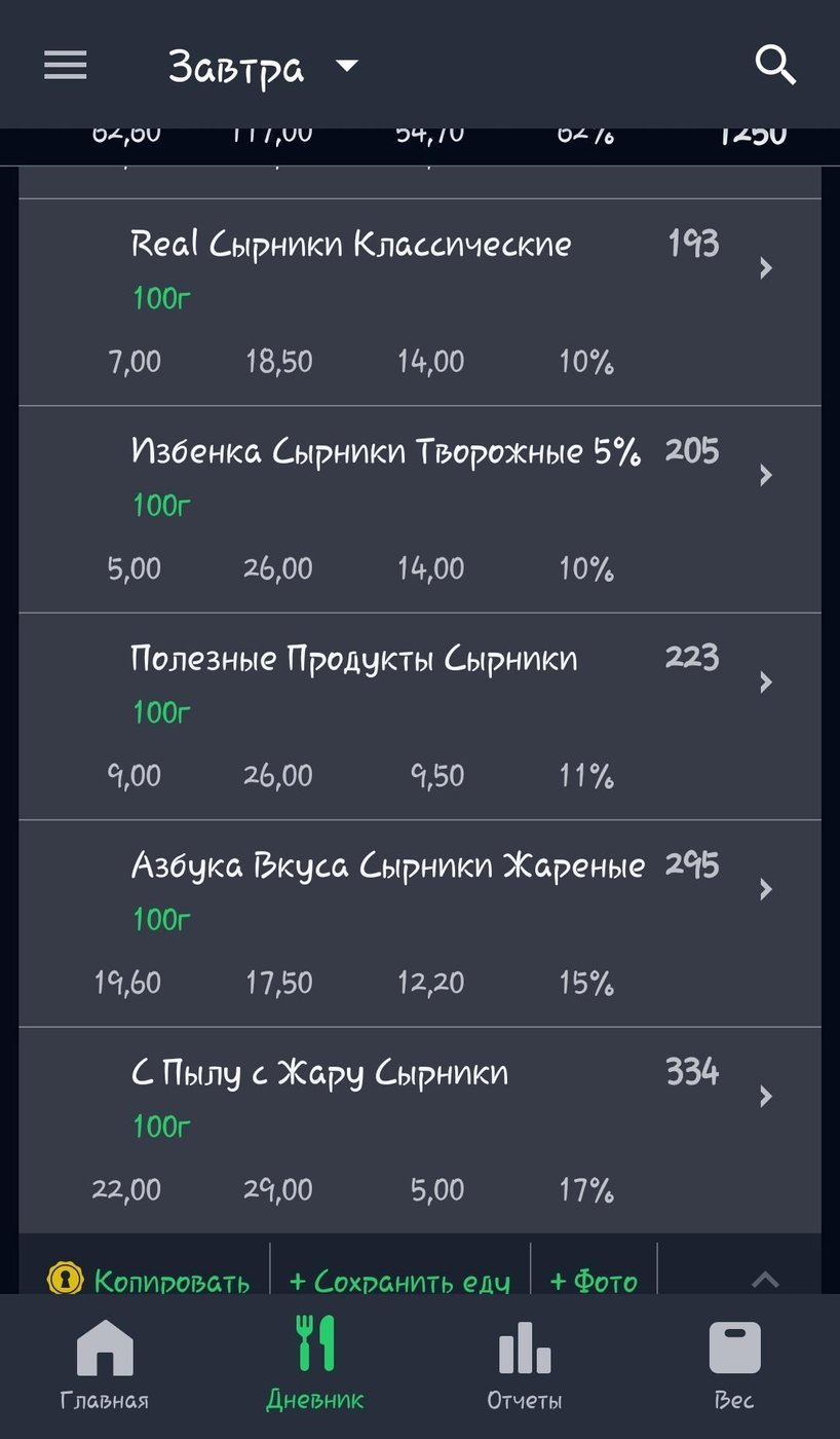 Опять же, видим сырники разной калорийности от 193 до 334 калорий. Разница почти в 140 калорий. Если так ошибиться 7 раз то получится 1190 калорий, а это не мало. Если весь год есть на завтрак сырники, то набежит 51000 калорий, привет ~5.5 кг жира.