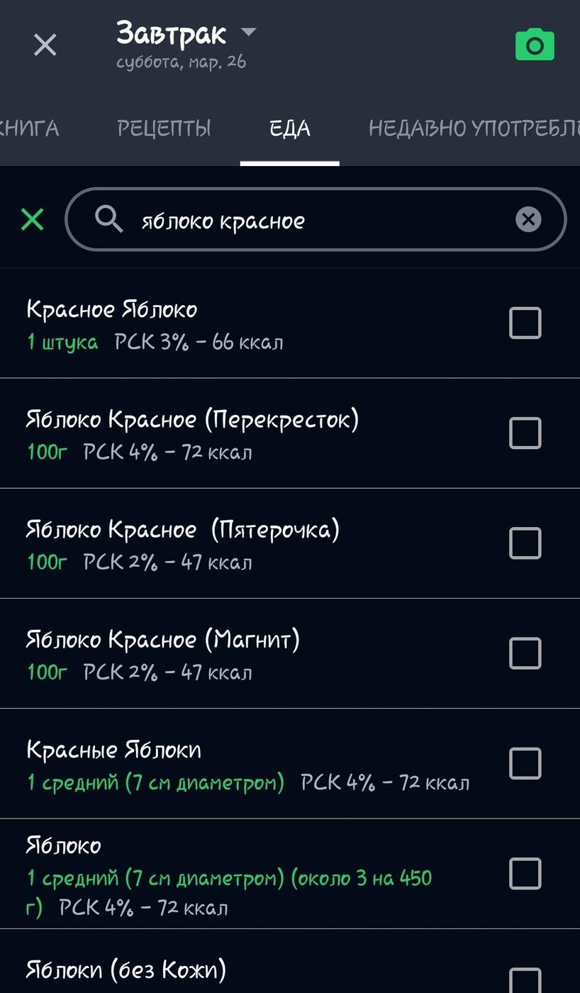 Систематические ошибки. Если при подсчетах ошиблись один раз, то это может быть проблемой. Но если ошибаемся постоянно, например я достаточно долго указывал не тот творог, то на длинной дистанции ошибка будет стоить не так дорого. Если набираем вес, то уменьшаем потребление калорий, при этом ошибка измерений не будет играть существенной роли, так как общее потребление энергии все равно снизили. В FatSecret можно сканировать штрихкоды, чтобы облегчить поиск продуктов и не ошибиться с выбором.