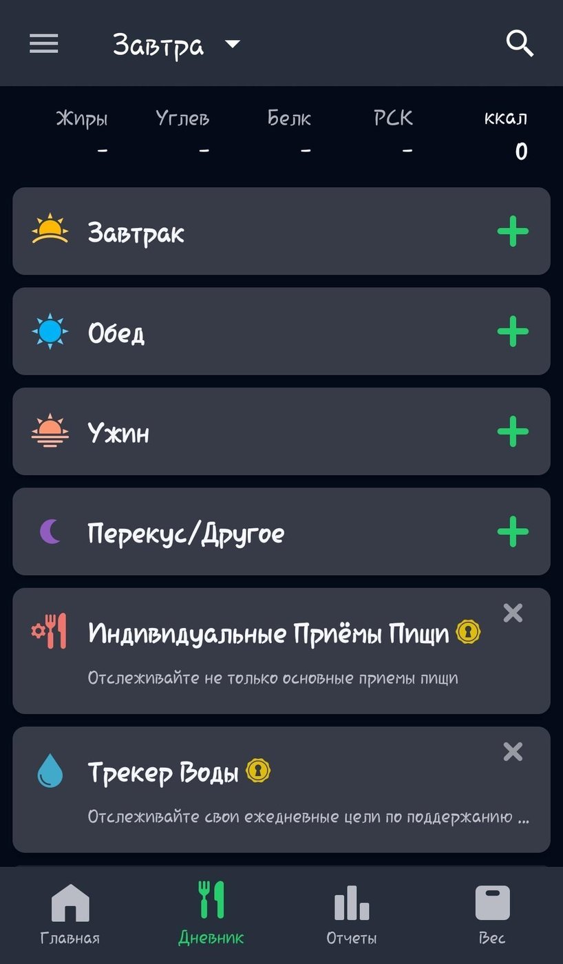 Во вкладке Дневник заносится информация по употребленным калориям. Удобно заносить данные подряд в соответствии с приемами пищи. 1 прием - завтрак, 2 - обед, 3 - ужин, 4 - перекус.