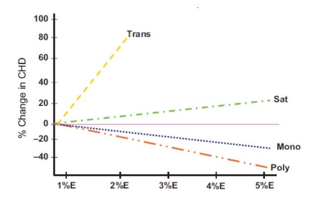 Выяснилось, что замена 5% калорийности углеводов на насыщенные жиры (зелёный график) приводит к увеличению риска развития коронарной болезни на 17%, замена 2% калорийности углеводов на трансжиры (желтый график) была связана почти с двукратным увеличением риска, замена 5% на мононенасыщенные жиры (синий график) уменьшала риск развития на 19% и замена 5% на полиненасыщенные жиры(оранжевый график) уменьшала риск развития коронарной болезни сердца на 38%.