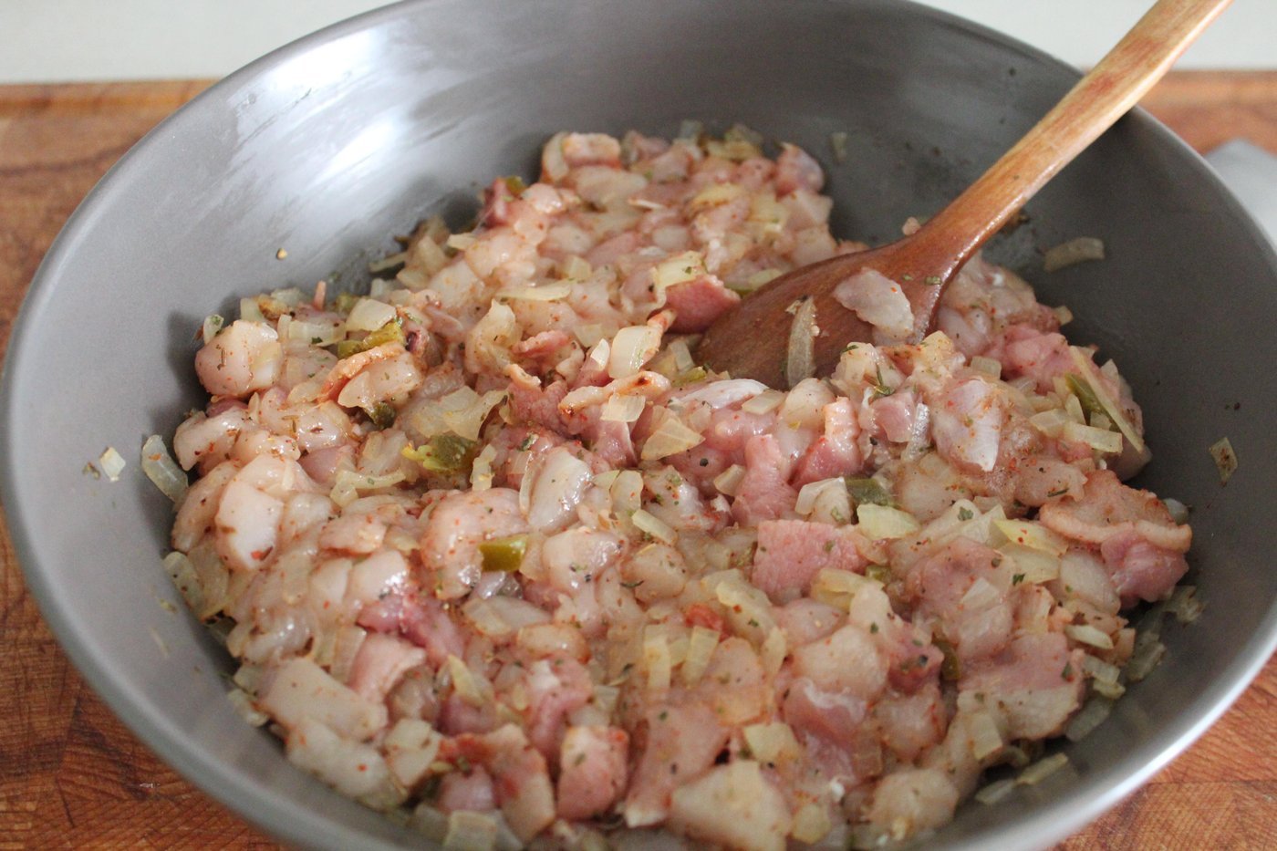 Разделываем бедра, нарезаем мелкими кубичками. С луком поступаем так же. Обжариваем минуты 3 лук и добавляем в фарш. Бекончик нарезаем и тоже жарим.