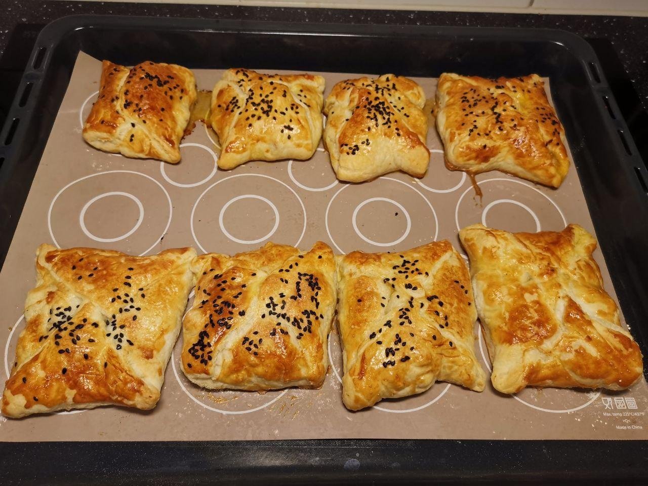 Раскатываем тесто тонко. Добавляем много начинки. Защипываем края, оставляя отверстие в середине. Сверху смазываем яйцом+соль+кунжут белый/черный. У меня не оказалось дома яиц, поэтому смазала сливками жирными. Кстати, рекомендую соль добавлять обязательно, т.к. покупное тесто пресное.