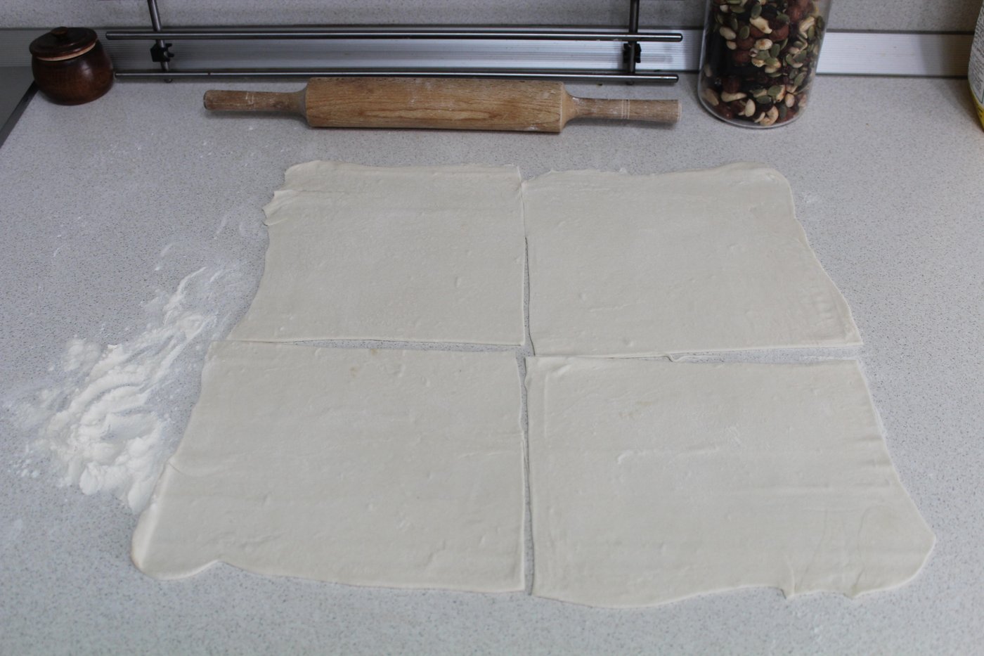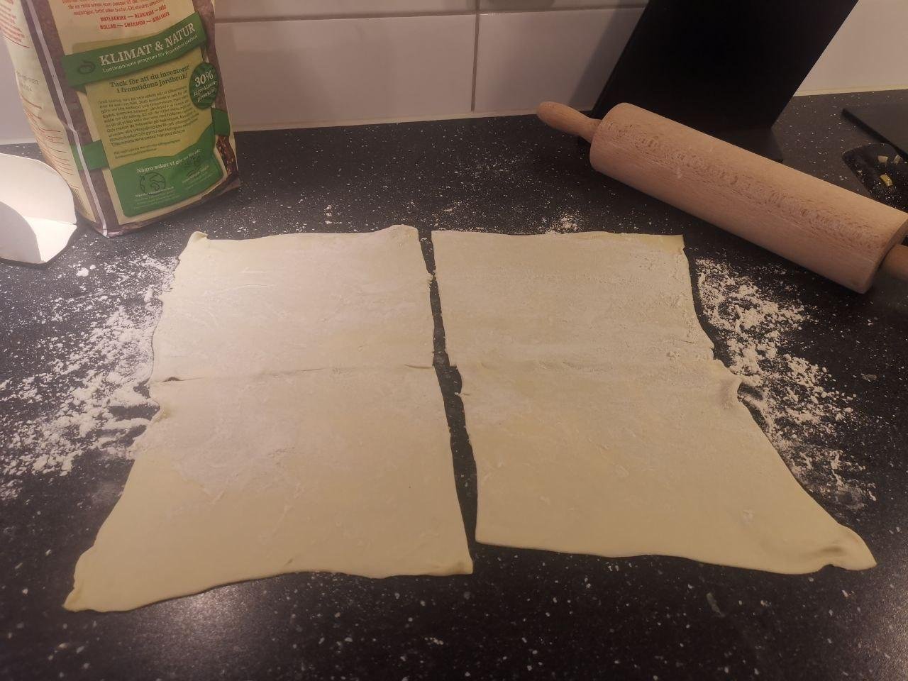 В упаковке было два листа. Я их раскатала и разделила на 8 частей, заготовок для самсулек. 4 штучки я делала квадратными, остальную партию треугольными.