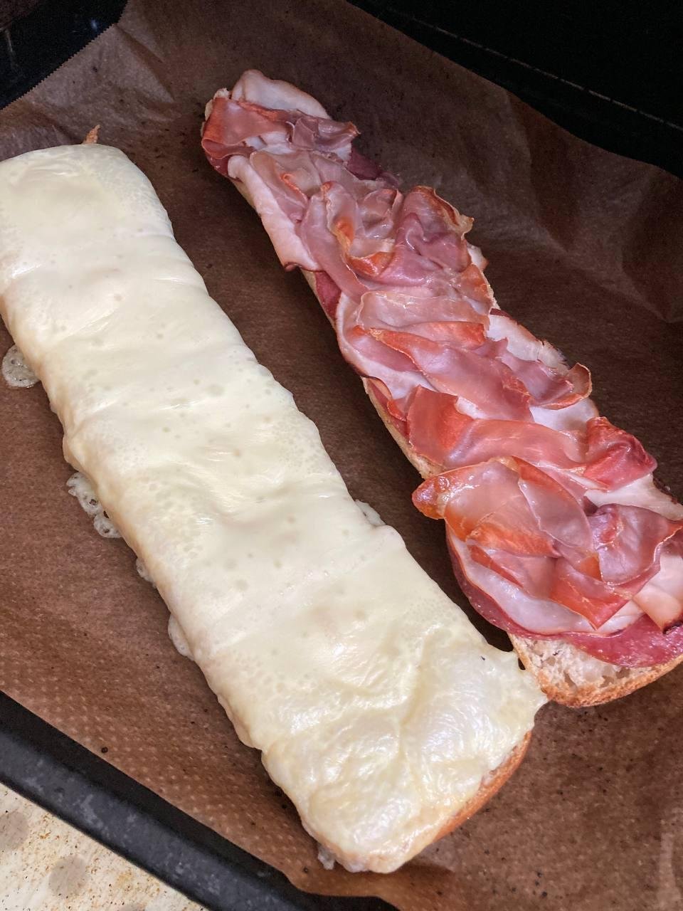 - Режем багет вдоль и все нажаренное и намешанное аккуратно выкладываем на багет