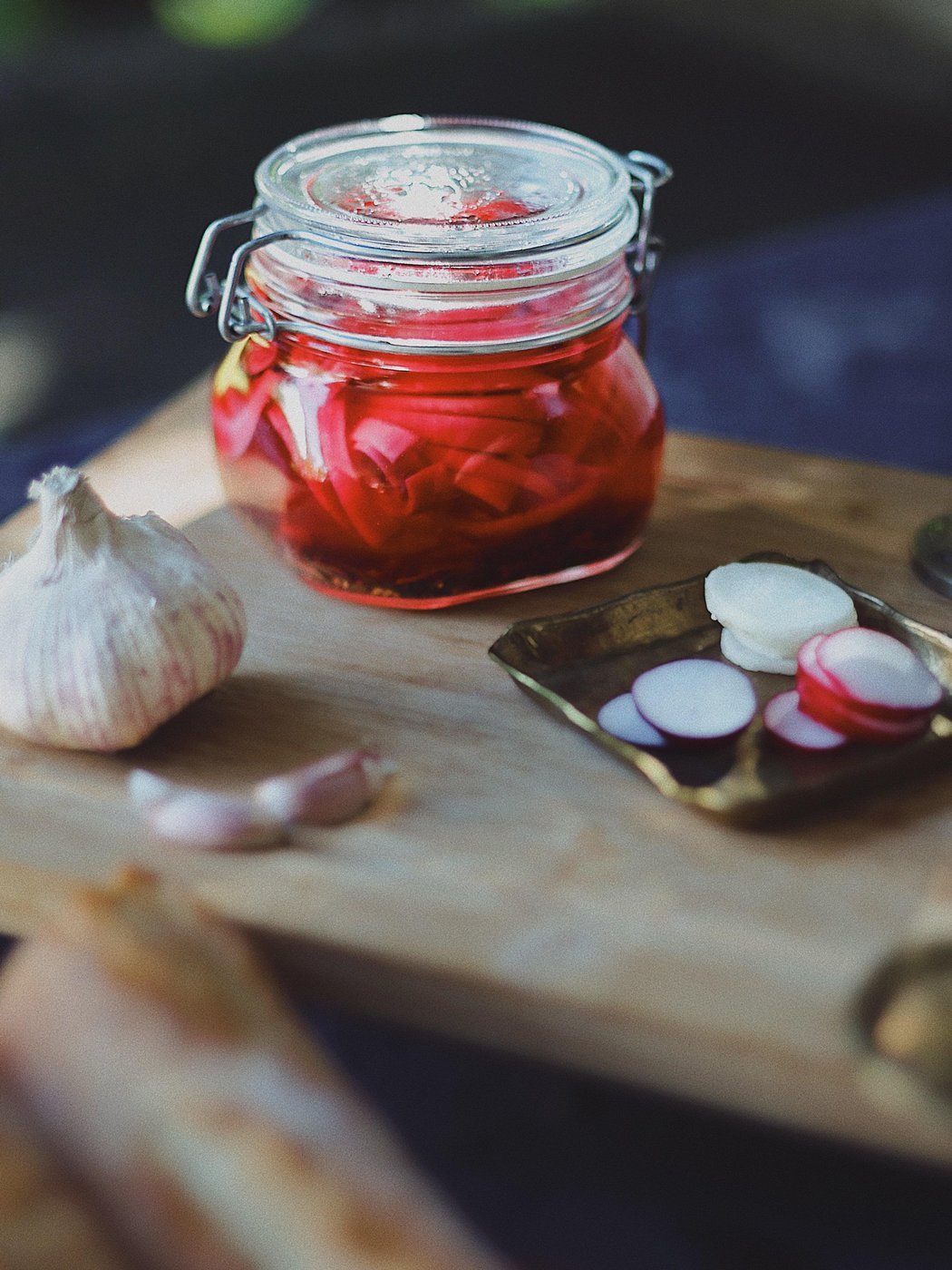 Решил, что нужно добавить сочности. Маринованного лука, который все рекомендуют у меня пока нет, но были не менее замечательные маринованные цуккини