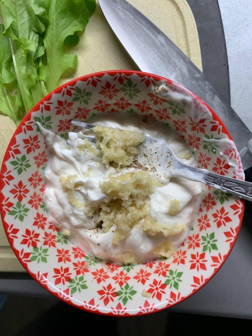 Для приготовления соуса для бутера берем майонез и выкидываем его в мусорку. Далее берем, примерно 150гр греческого йогурта (я со стенок не соскребал, так что осталось примерно 130), пару ложек сметаны, соль\перец\чеснок по вкусу. Чеснок давим, и все это дружно перемешиваем.