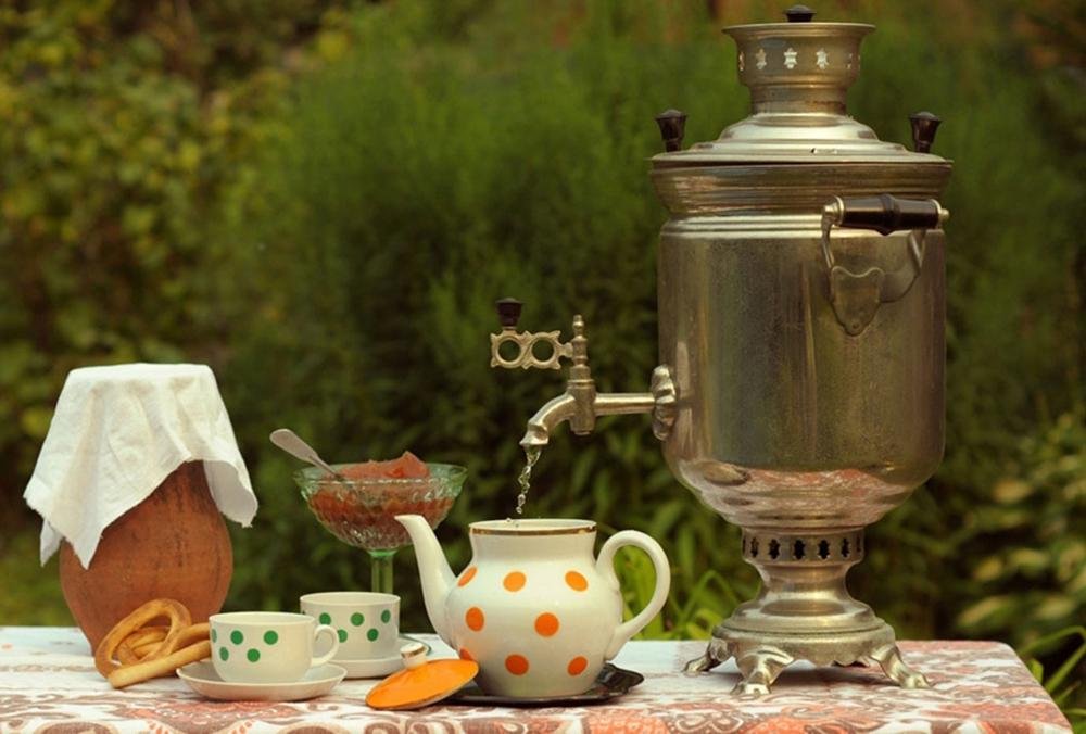 Капризный орденоносный самовар с дырявым сапогом вместо трубы наконец закипел. Маленькие, округлые деревянные ручки норовят выскользнуть из пальцев, пока аккуратно открываешь ногой скрипящую дверь. На столе уже стоит фигурный медный поднос и белый в крупный красный горох заварочник. После наполнения чайничка дымным кипятком он водружается на корону поверх самовара, из носика вьется тонкая струйка пара.
