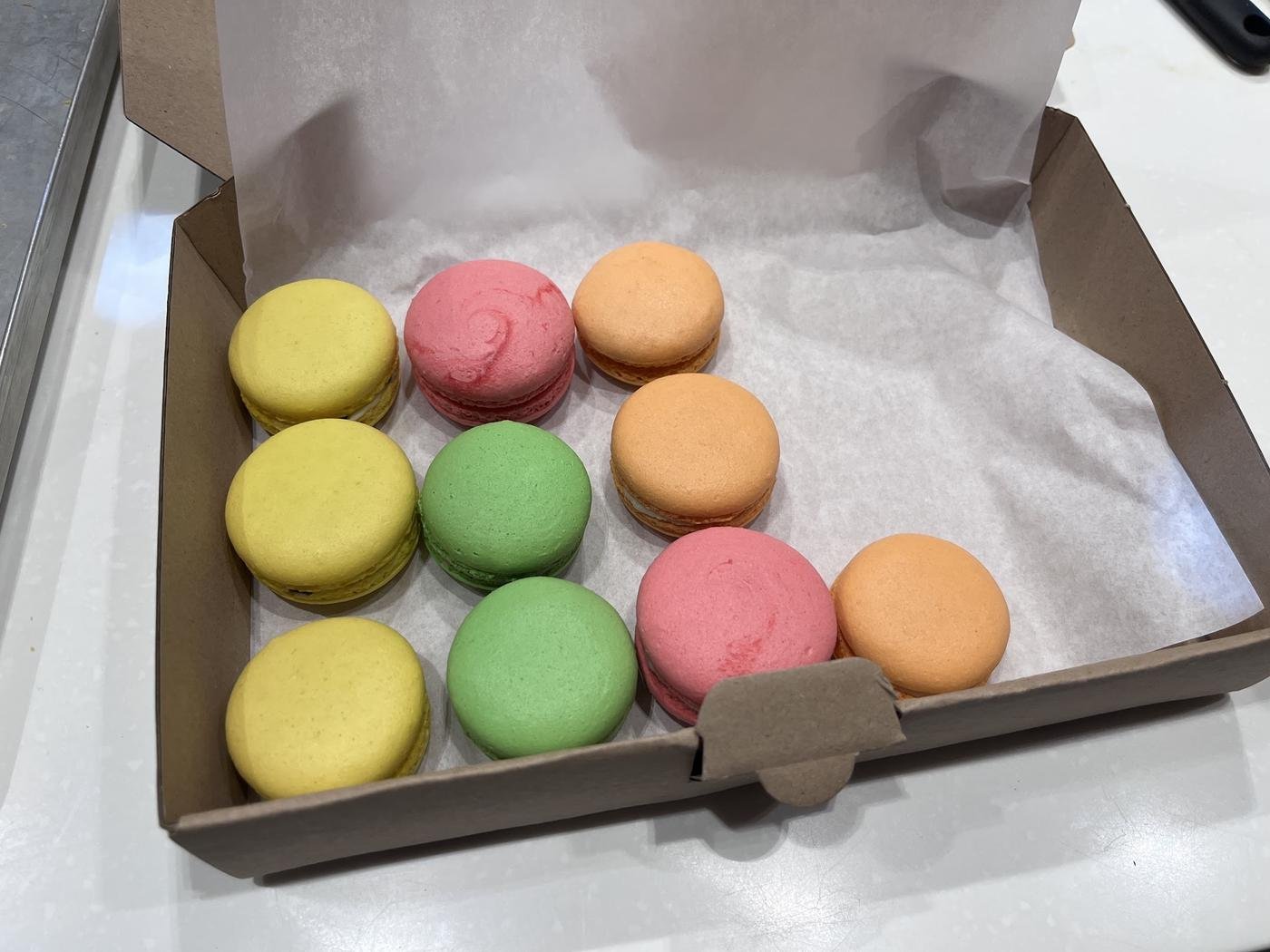 Мы готовили две партии макарунов: первую под тщательным контролем преподавателя, соблюдая все правила, а вторую — как смогли, сами. В первой партии мы добавляли краситель, а во второй печеньки были просто белые.