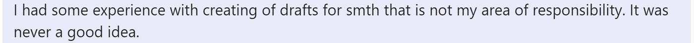 Таким образом вы показываете коллеге, что вы не самый умный в комнате, а вы пошли и погуглили (и минимально смекалистый коллега поймёт, как в следующий раз поступать). Плюс вы делаете какой-то полезный вклад — показываете ссылку, которая должна разблокировать коллегу, помочь ему двигаться дальше. И наконец, вы не утверждаете, что вы — истина в последней инстанции и что вы берете на себя ответственность за применение именно этого подхода, а готовы вместе посотрудничать (если не готовы, то конечно не надо так и писать), чтобы найти лучшее.