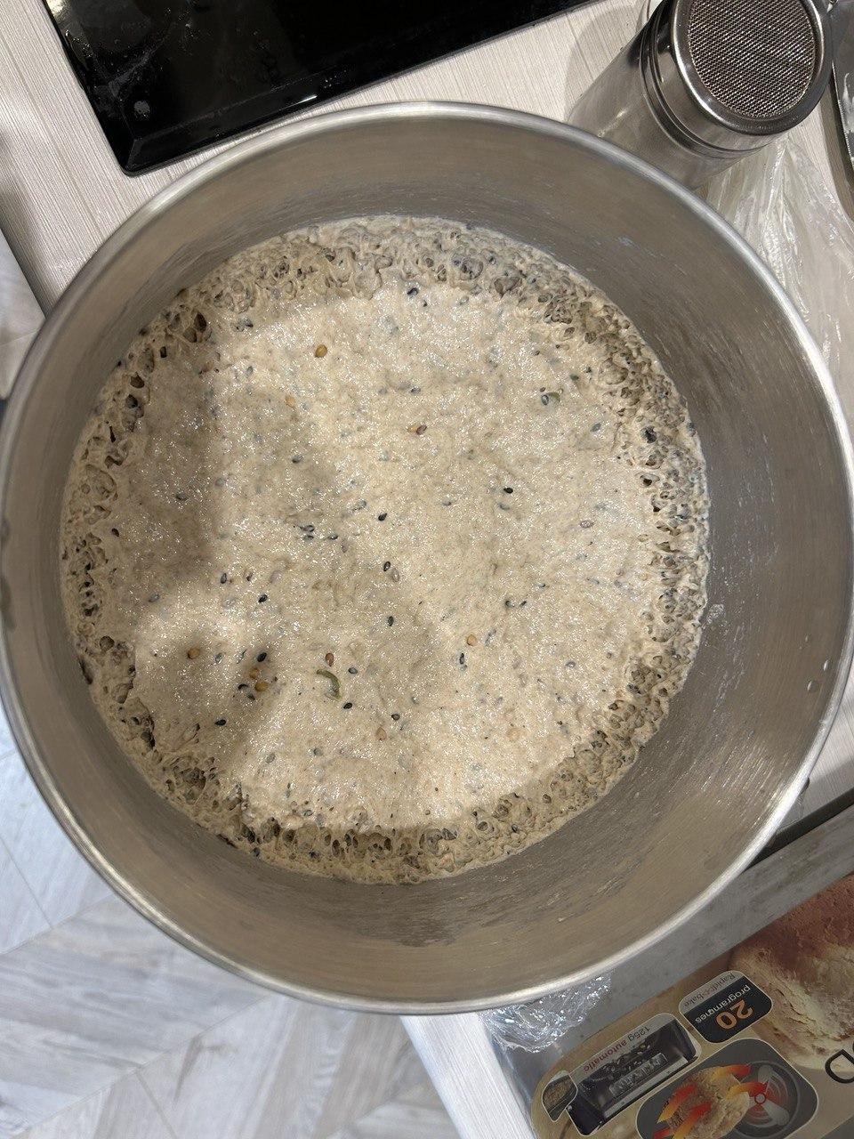 - 👨🍳 Этот процесс может происходить по желанию и всю ночь в холодильнике, если например поставить «опару» и семечки утром, замесить тесто вечером, а выпекать — утром.