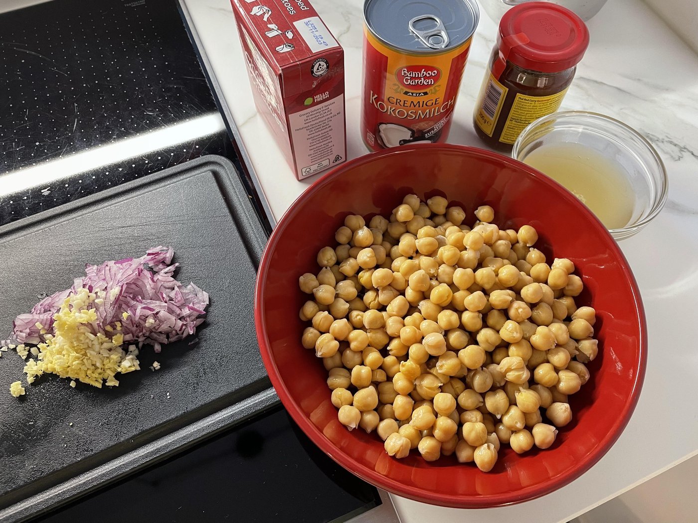 Тут всё просто, мне попался рецепт вегетарианского карри с тыквой и нутом. Я его немного поменял, но смысл такой же. У меня стояло 100500 пачек нута из HelloFresh, которые присылали в избытке. Купил красной карри пасты (внезапно тайской, другой не было в магазине) и кокосового молока, тыкву, остальное было.