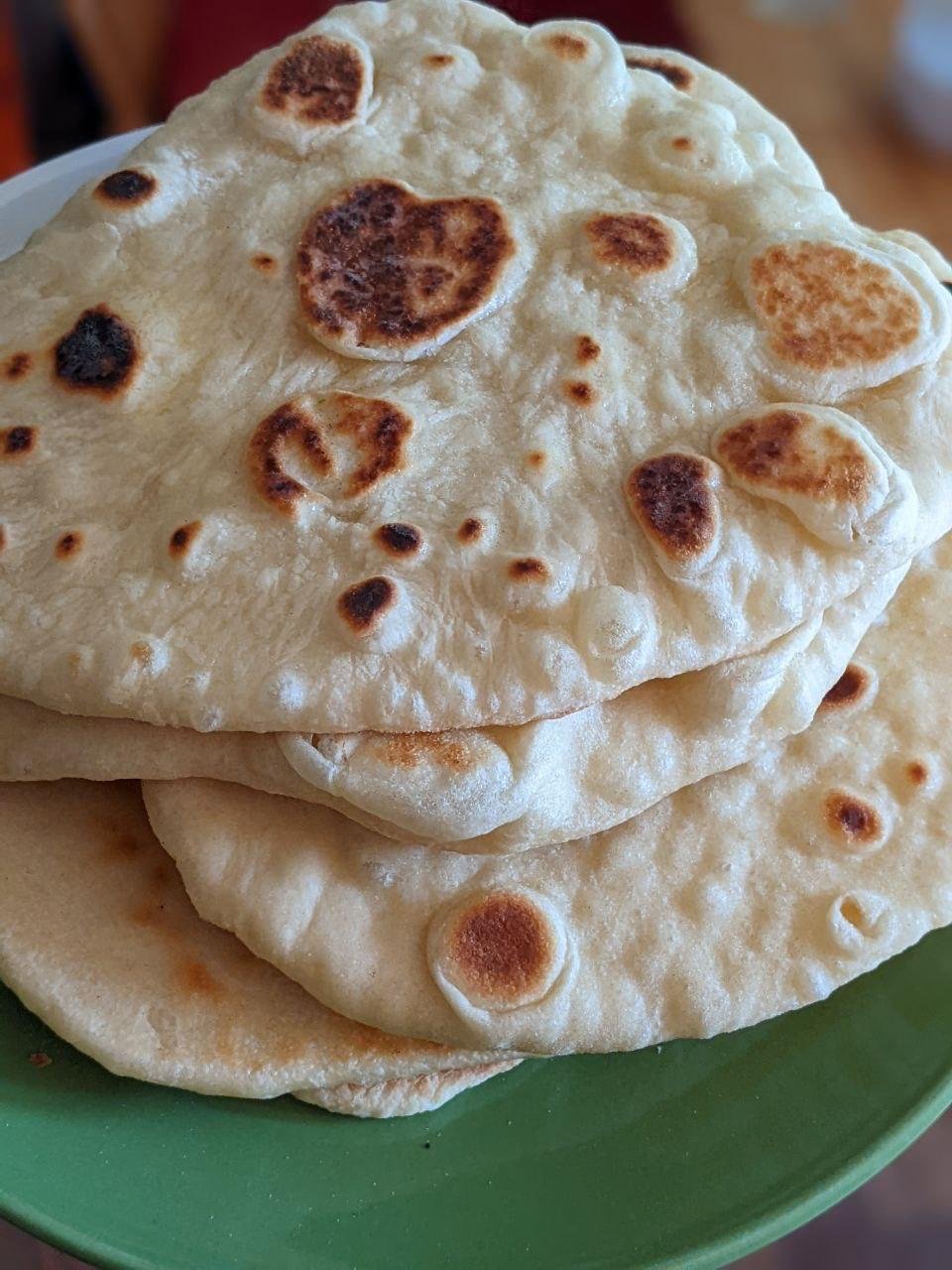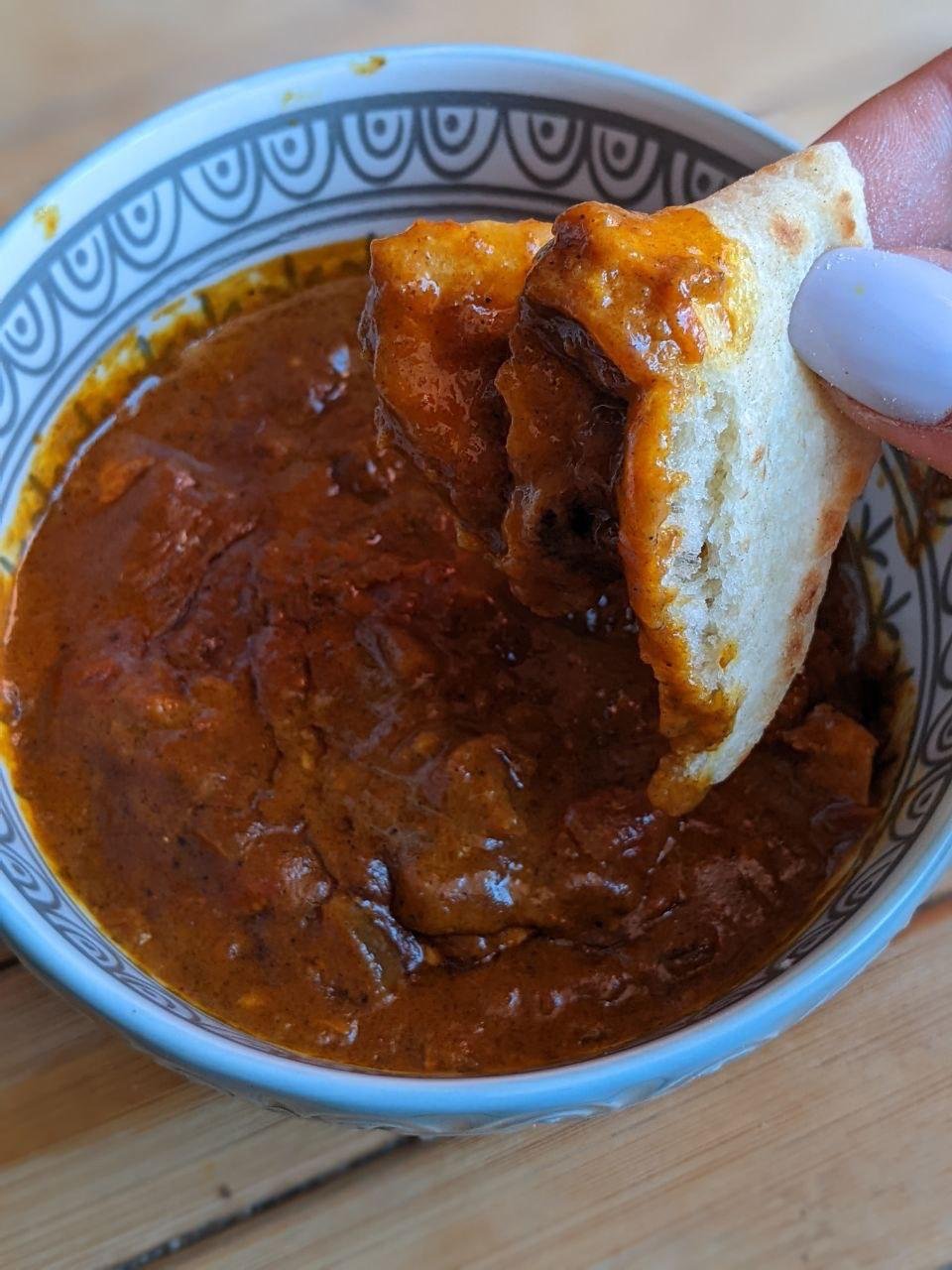 Для пущего гедонистического восторга подавать можно с традиционными лепешками — нааном — они мягкие, как облачка, и существуют для того, чтоб их в карри макать. Я готовлю вот по этому рецепту - https://www.budgetbytes.com/naan/ - на чугунной блинной сковороде. Подозреваю, что «чугунная» и «блинная» - опциональны, и готовить можно на любой. Плюс, тесто я вымешиваю не вручную, а в комбайне (я вообще, как несложно заметить — очень ленивый повар), выходит примерно вот так: