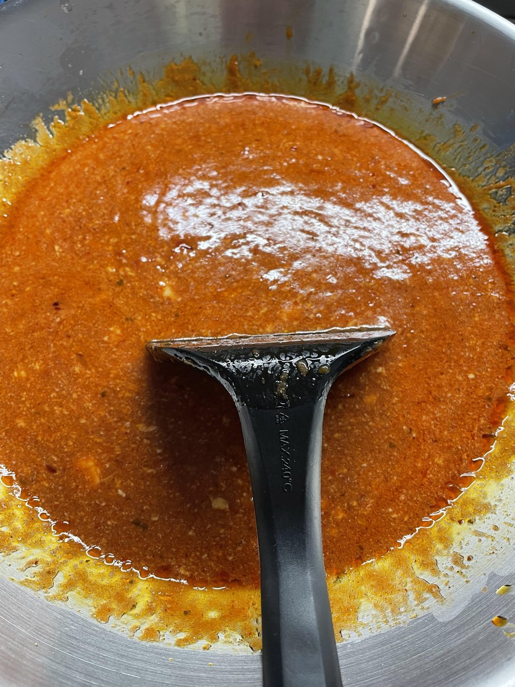 - Обратите внимание, что соус будет концентрироваться при загустении, так что если на этом этапе вам недостаточно соли или чили на пробу, не надо фиксить это сейчас, дождитесь нужной консистенции и регулируйте соль и остроту уже тогда.
