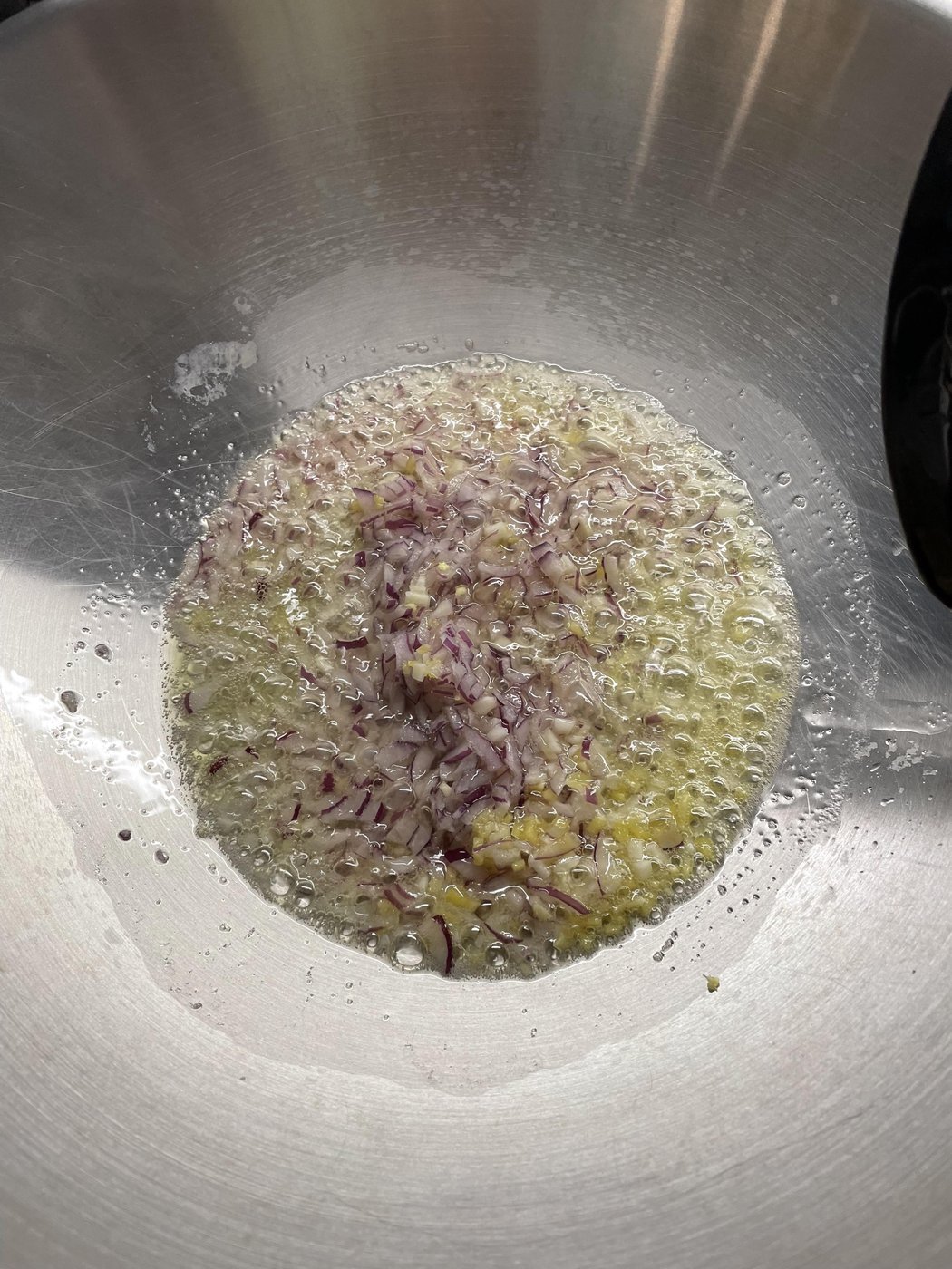 - В воке или сковороде готовим лук+чеснок+имбирь на масле, недолго, пару минут: