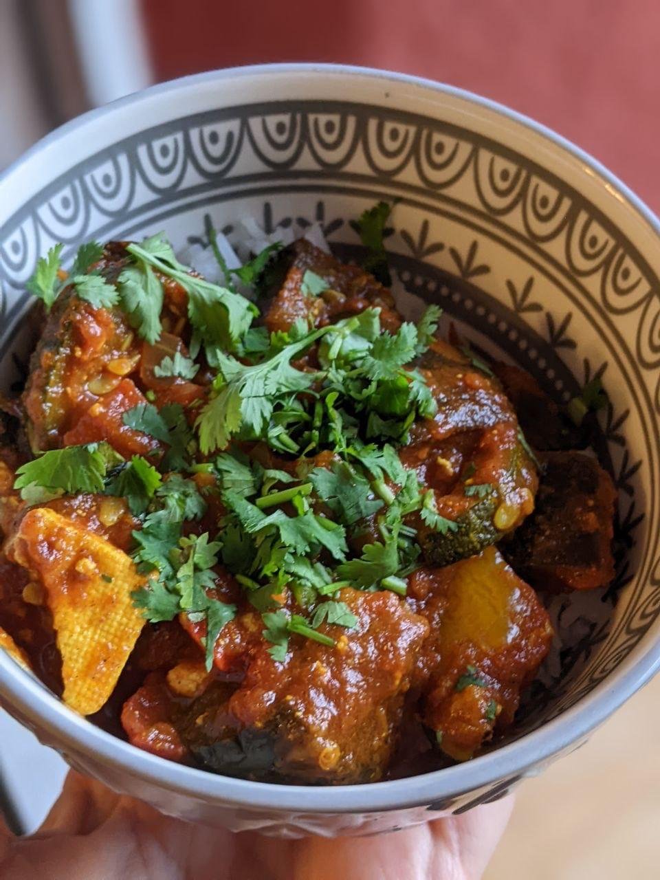 - Подавайте с рисом, посыпав сверху рубленой кинзой.
