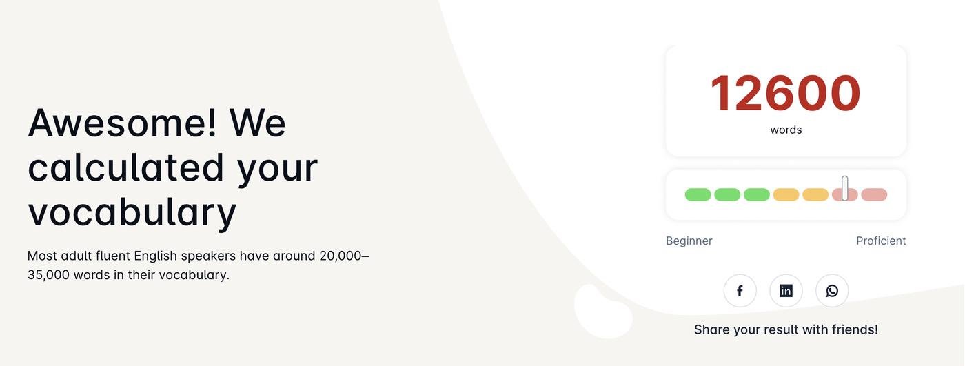Мой путь был таким примерно: я учился в школе/институте, но до 3 курса язык был где-то на уровне B1. Потом мне нужно было поехать в США на летнюю стажировку в местный универ. Я целый год потреблял контент исключительно по-английски 24/7. Т.е. слушал подкасты по 3-4 часа в день (в дороге), смотрел сериалы, читал интернеты. Не учил слова никогда: мне кажется, в отрыве от контекста это бесполезно. Тем летом было очень сложно, меня с головой погрузили в английский, а я говорил с сильным акцентом и коряво. Но это дало толчок для следующего года, когда я готовился к TOEFL с прицелом на поступление в американский универ. Потом я провел еще одно лето в США, и после этого примерно был на уровне С1, сдал TOEFL на что-то типа 110. С тех пор читаю по ~15-20 книг на английском в год, все кино и сериалы смотрю на английском. Сейчас, спустя 8 лет, я уже на уровне С2 без дополнительных усилий - чисто за счет контента (в твоем тесте у меня 29к получилось). Я живу в Германии, так что общаюсь часто тоже на английском. Минус в том, что мне теперь комфортнее общаться по-английски, чем по-русски. Но при этом мой язык - исключительно современный, старые (18-19 века) книги я читать не могу, т.к. мой словарный запас старых слов очень маленький.